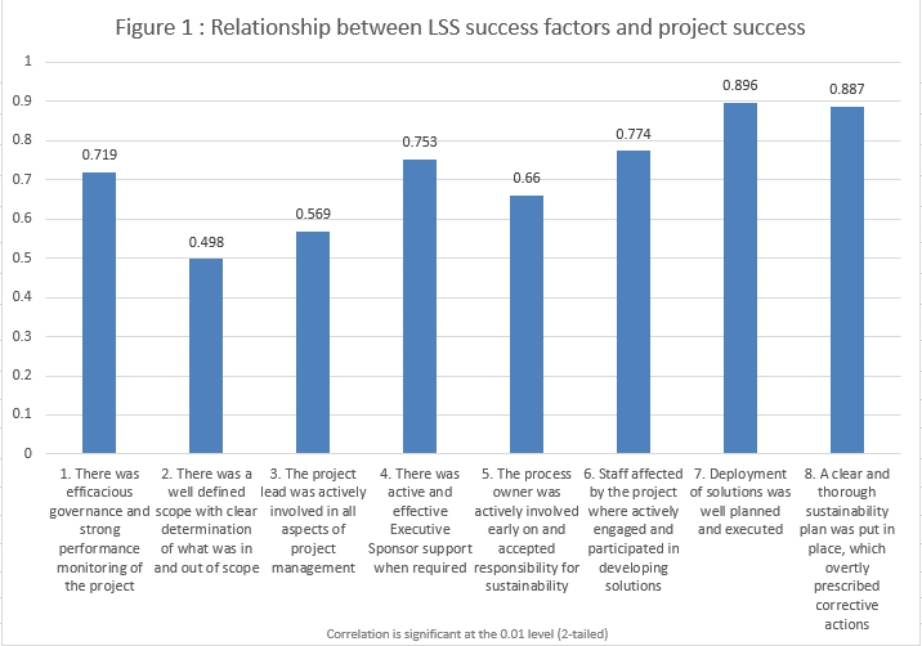 Figure 1 depicts correlation coefficients of the LSS success factors identified by the LSS experts. It also reveals the success and failure of the 62 projects implemented in the Melbourne healthcare organization. Therefore, this chart shows the relationship between LSS success factors and project success in the LSS implementation in healthcare organizations.