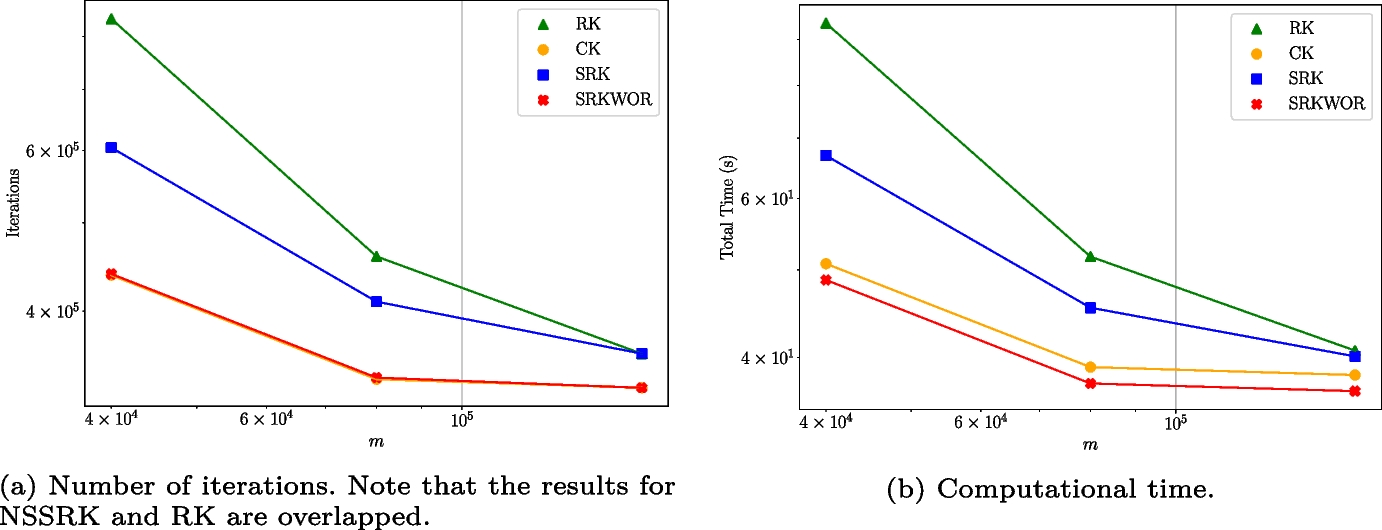 For the NSSRK method, the selectable set is updated in each iteration by simply using all rows except the row that was sampled in the previous iteration. In that case, the last step of the algorithm can be written as \(\mathcal {S}_{k+1} = [m] \backslash i_k\).