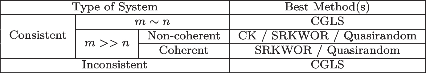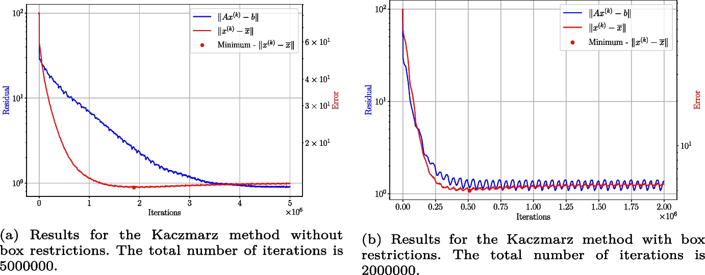 where \(r_{LS} = b - A x_{LS}\) is the least-squares residual. This extra term is called the convergence horizon and is zero when the linear system is consistent. Note that the rate of convergence of the algorithm depends only on the scaled condition number of A, and not on the number of equations in the system. This analysis shows that it is not necessary to know the whole system to solve it, but only a small part of it. Strohmer and Vershynin show that in extremely overdetermined systems the Randomized Kaczmarz method outperforms all other known algorithms and, for moderately overdetermined systems, it outperforms the celebrated conjugate gradient method. They reignited not only the research on the Kaczmarz method but also triggered the investigation into developing randomized linear solvers.