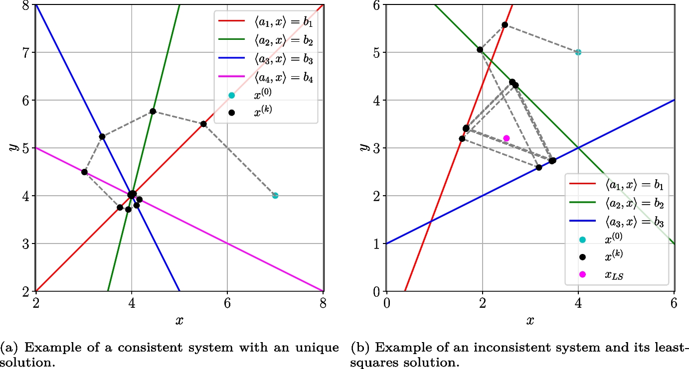 The Kaczmarz method has a clear geometric interpretation (if the relaxation parameter \(\alpha _i\) is set to 1). Each iteration \(x^{(k+1)}\) can be thought of as the projection of \(x^{(k)}\) onto \(H_i\), the hyperplane defined by \(H_i = \{x: \langle A^{(i)}, x \rangle = b_i \}\). Figure 1 provides the geometrical interpretation of a linear system with 4 equations in 2 dimensions: each equation of the system is represented by a line in a plane; the evolution of the estimate of the solution, \(x^{(k)}\), is also shown throughout several iterations. Since we are using the rows of the matrix cyclically, we start by projecting the initial estimate of the solution onto the first equation and then the second, and so on. Figure 1a shows a consistent system with a unique solution, \(x^*\), the point where all equations meet. It is clear that the estimate of the solution given by the Kaczmarz method will eventually converge to some vector \(x^*\). In Fig. 1b we have an inconsistent system with its least-squares solution marked by the magenta dot. Note that Kaczmarz cannot reach it since the estimate of the solution will always remain a certain distance from \(x_{LS}\). In the next section, we show how this distance can be quantified.