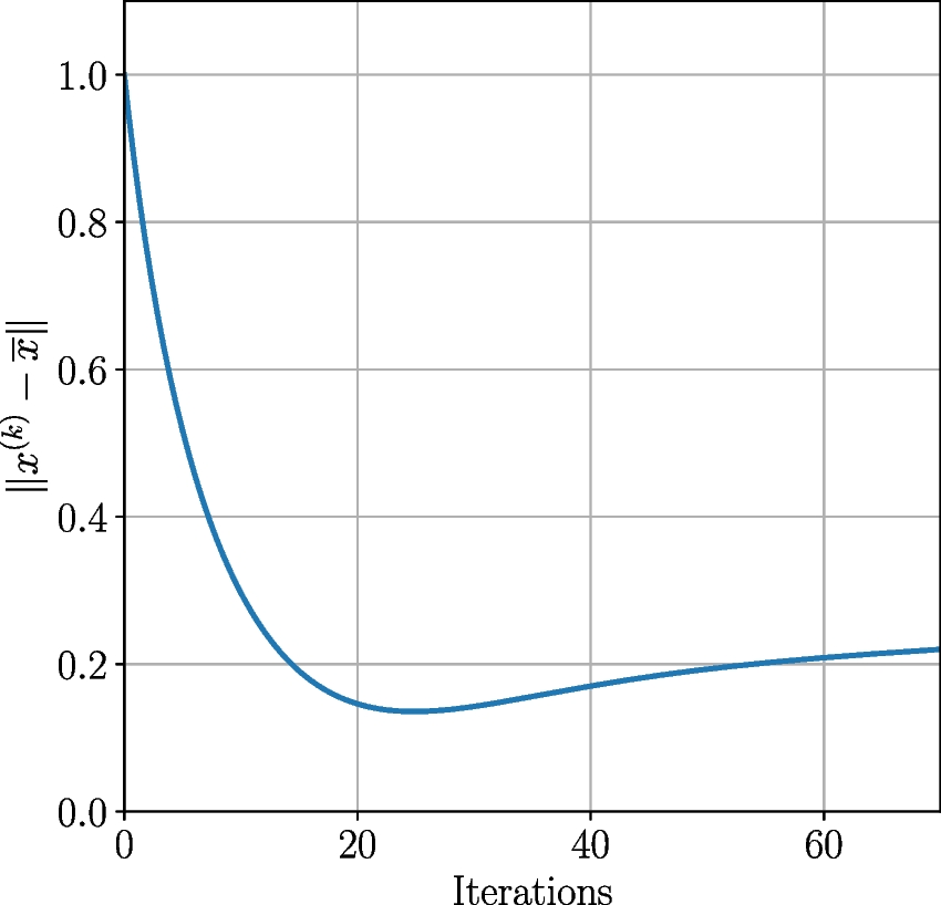 where the Frobenius norm of a matrix is given by \(\Vert A\Vert _F = \sqrt{\sum _{i=1}^{m} \Vert A^{(i)}\Vert ^{2}}\). This version of the algorithm is called the Randomized Kaczmarz (RK) method. Strohmer and Vershynin proved that RK has exponential error decay, also known as linear convergence.1 Let \(x_0\) be the initial guess, \(x^*\) be the solution of the system, \(\sigma _{\min }(A)\) be the smallest singular value of matrix A, and \(\kappa (A) = \Vert A\Vert _F \, \Vert A^{-1}\Vert = \Vert A\Vert _F / \sigma _{min}(A)\) be the scaled condition number of the system’s matrix. The expected convergence of the algorithm for a consistent system can then be written as