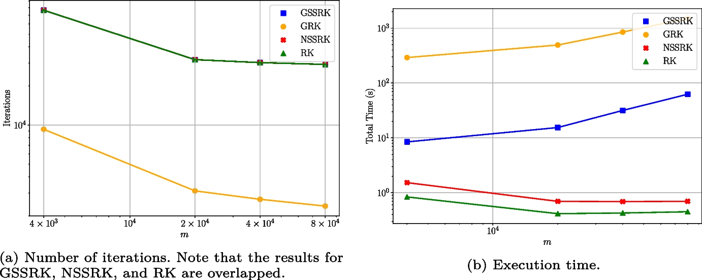 In terms of performance, the authors observed that: NSSRK and RK are almost identical; GRK outperforms GSSRK, NSSRK, and RK; depending on the data sets, GSSRK can either outperform NSSRK and RK or it can be similar to RK. It is important to note that these conclusions were only made in terms of how fast the error decreases as a function of the number of iterations. There is no analysis of the performance of the algorithms in terms of computation time.