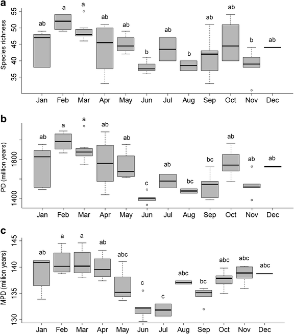 Species richness (a), Phylogenetic diversity (PD: b) and mean pairwise difference (MPD: c) of bird communities throughout the annual cycle. Non-significant pairwise differences between months are indicated by the presence of the same letter