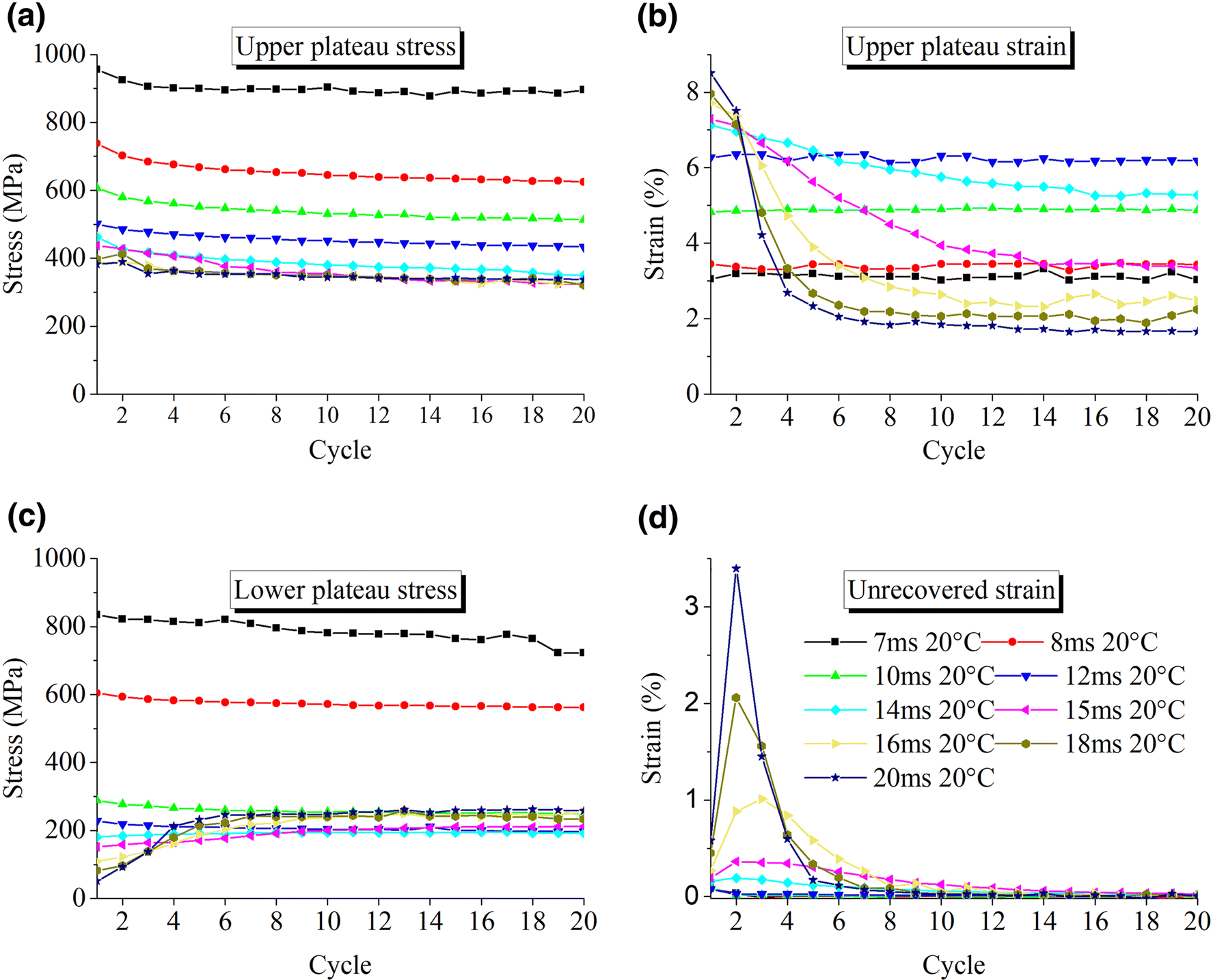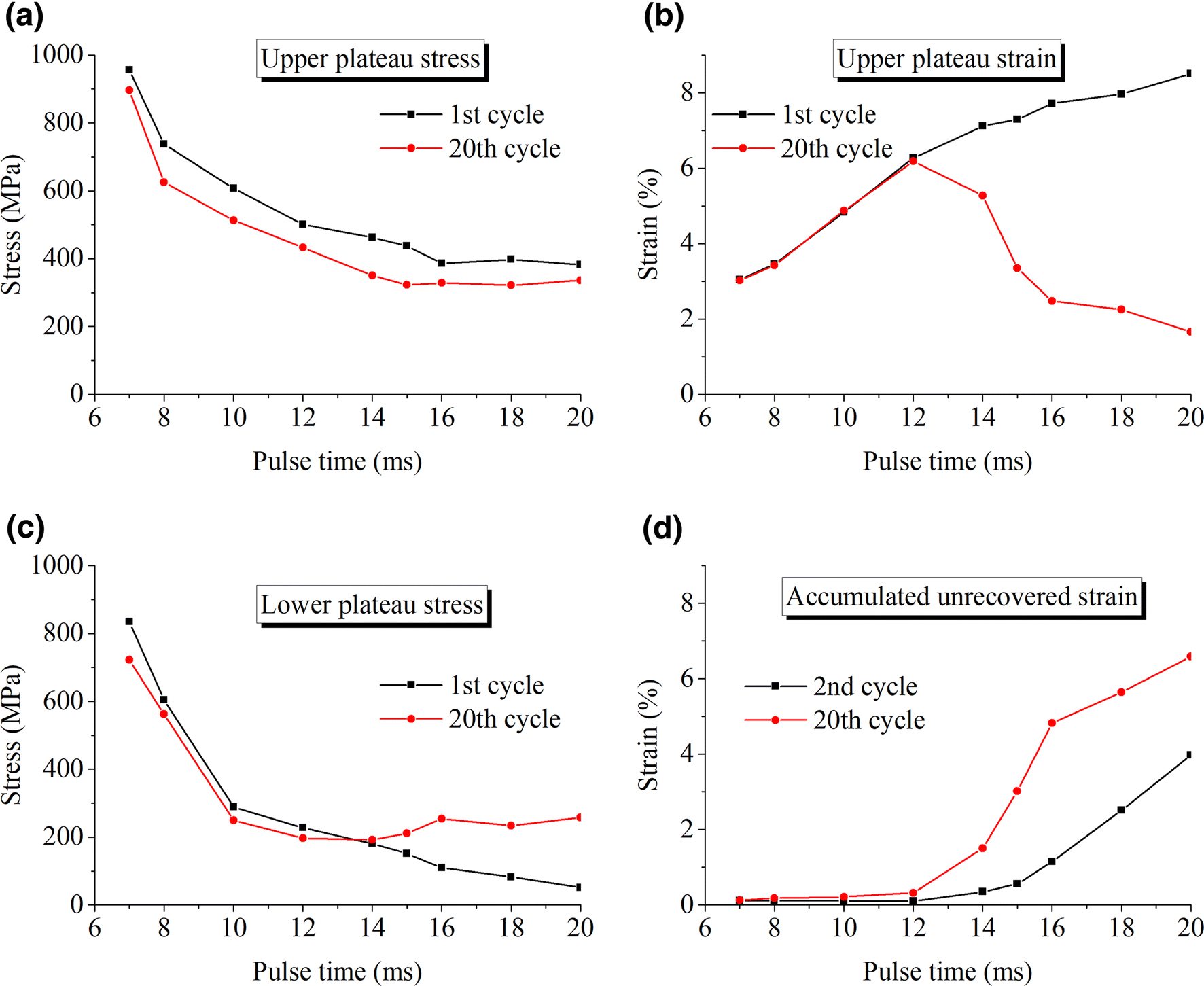 Figure 10 shows the evolution of material parameters upon cycling. The upper plateau stress slightly decreases upon cycling in all wires (Fig. 10a). The lower plateau stress (Fig. 10c) practically does not change upon cycling in case of 7–12 ms wires but increases with increasing pulse time in the early cycles of 14–20 ms NiTi wires. The upper plateau strain remains constant in 7–12 ms wires but decreases with number of cycles in case of 14–20 ms wires. The unrecovered strain in a superelastic cycle also decreases with number of cycles in 14–20 ms wires, but surprisingly, maximum unrecovered strain is not observed in the first cycle but in the second or third cycle (Fig. 10d). The stability of cyclic superelastic deformation of various NiTi wires can be assessed by comparing the parameters characterizing the cyclic stress–strain responses in the 1st and 20th cycle in Fig. 11. Clearly, the cyclic stability of superelastic responses of 7–12 and 14–20 ms wires is rather different (Fig. 11b, d).