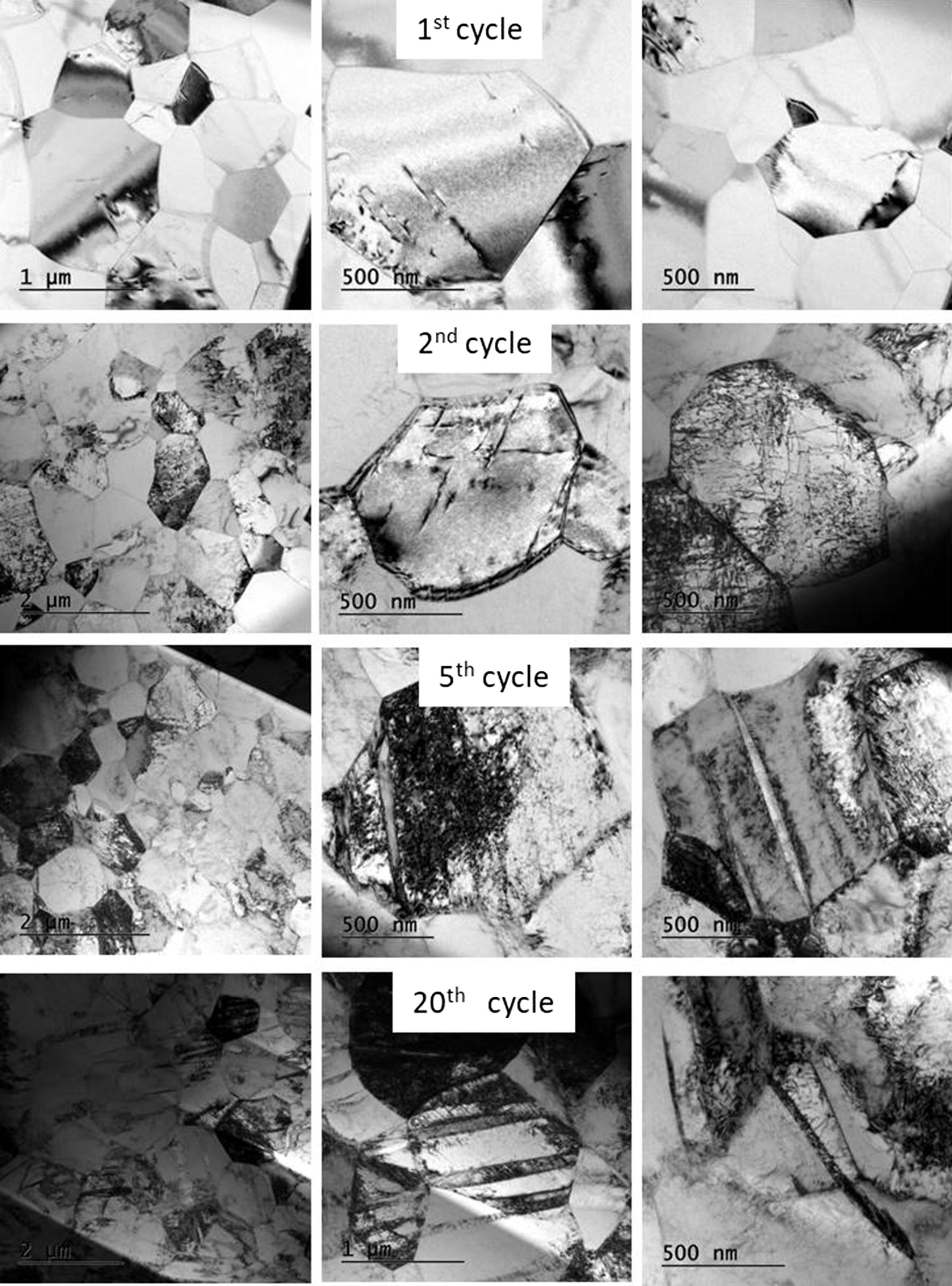 In order to investigate the origin of the instability of cyclic deformation, lattice defects created during the cyclic superelastic deformation of one selected 16 ms wire at room temperature were observed by TEM on thin lamellas prepared from cycled wires (Fig. 12). The rationale behind selecting the 16 ms wire is that the grains are sufficiently large and free of lattice defects from previous cold work, which enables TEM analysis of lattice defects created by the cyclic superelastic deformation. The cyclic instability of the 16 ms wire in the first 20 cycles at room temperature (Fig. 9g) allows for linking the TEM results to the cyclic instability. The results are presented in a form of microstructures observed in wires deformed by 1, 2, 5, 20 cycles in Fig. 12. Let us point out that, according to our in situ X-ray diffraction experiments on the 16 ms wire [16], this wire transforms at room temperature almost completely to the martensite phase in the first cycle. This means that the crystal lattice was completely martensitic at the end of the stress plateau in the first cycle (Fig. 9g). All stress induced martensite retransformed back to the austenite upon unloading and we could only observe isolated slip dislocations left within the microstructure after the first cycle (Fig. 12—1st cycle). This corresponds to the experimental observations that almost all strain was recovered in the first cycle. However, significantly higher dislocation density was observed after the second and fifth cycles. This corresponds to the fact that maximal unrecovered strains were observed in the 2nd and 3rd cycle (Fig. 10d). After the 5th cycle, the observed density of dislocations became considerably higher and even isolated {114} austenite twins were occasionally found (see [4, 7, 8] for identification and analysis of the {114} austenite twins in deformed microstructures). After the 20th cycle, when the accumulated unrecovered strain approached nearly 7%, {114} austenite twins became common defects in the microstructure of cyclically deformed 16 ms wire.