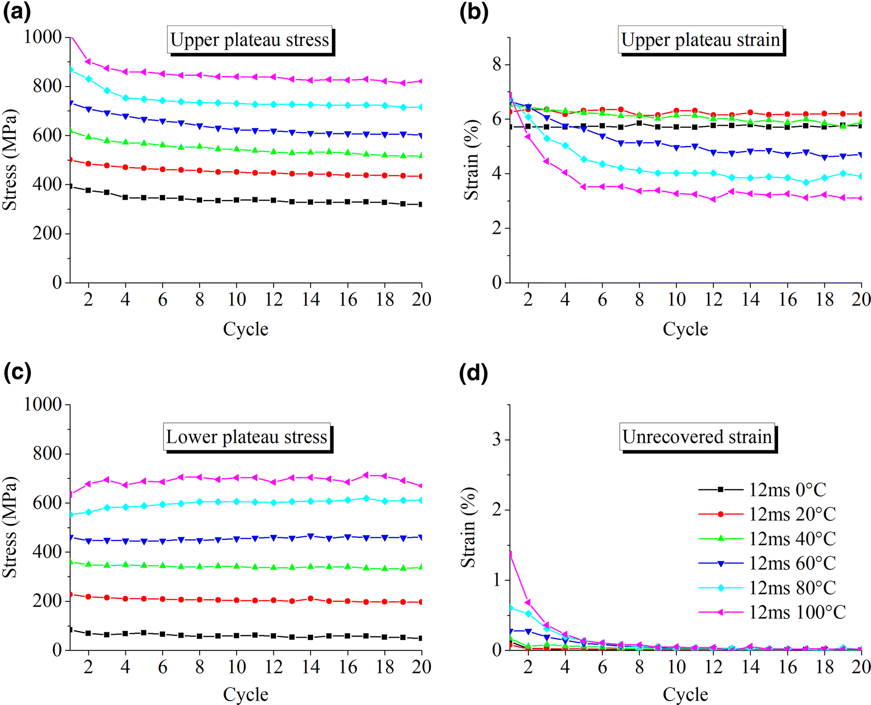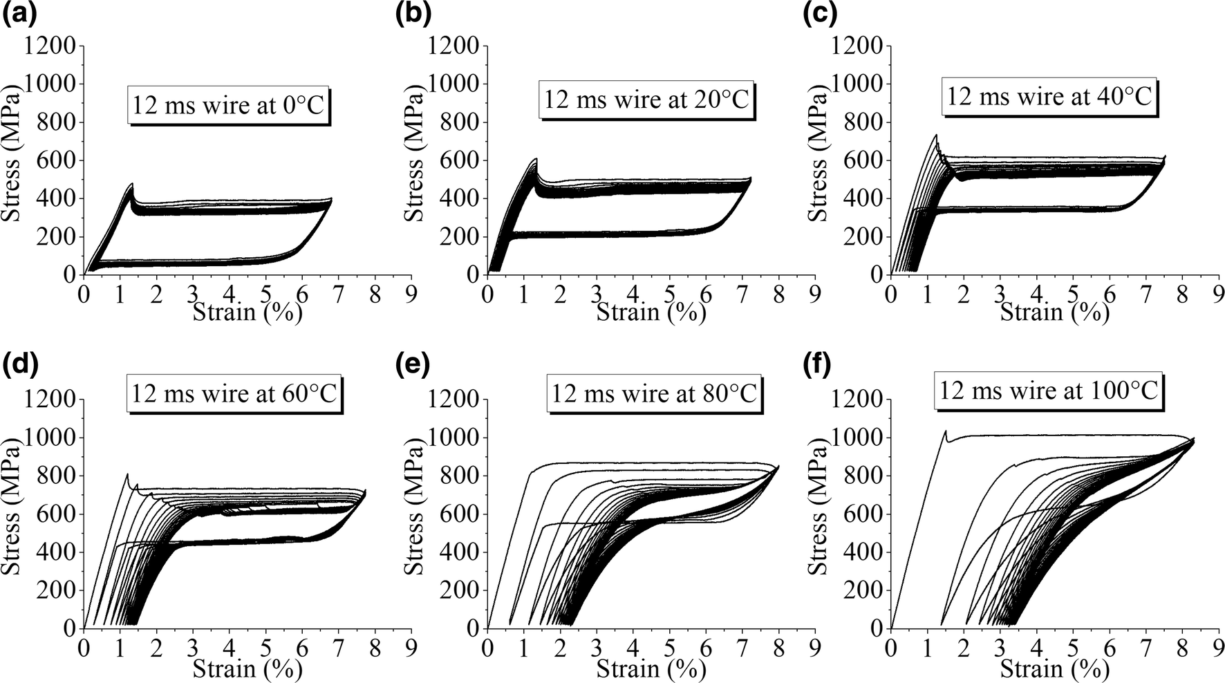 The stability of cyclic superelastic response depends not only on the wire microstructure but also on the test temperature. Figure 13 shows cyclic superelastic stress–strain response of 12 ms wire at (0, 20, 40, 60, 80, 100) °C test temperatures. The 12 ms wire has a nano-grained microstructure (Fig. 2b) almost identical to the microstructure of the commercial straight annealed FWM #1 wire [5]. Note that, while the superelastic stress–strain response of the 12 ms wire is relatively stable in the narrow temperature range 0–20 °C, it gradually becomes unstable at elevated temperatures 40–100 °C. While the upper plateau stress decreases upon cycling, the lower plateau stress remains constant (Fig. 14). The upper plateau strain and unrecovered strain became unstable and evolve upon cycling, particularly at elevated temperatures above 40 °C. Figure 15 assesses the cyclic stability of the 12 ms wire at various temperatures by comparing the parameters characterizing the cyclic stress–strain responses in the 1st and 20th cycle. It shows that the cyclic instability starts to develop at temperatures just above the body temperature.