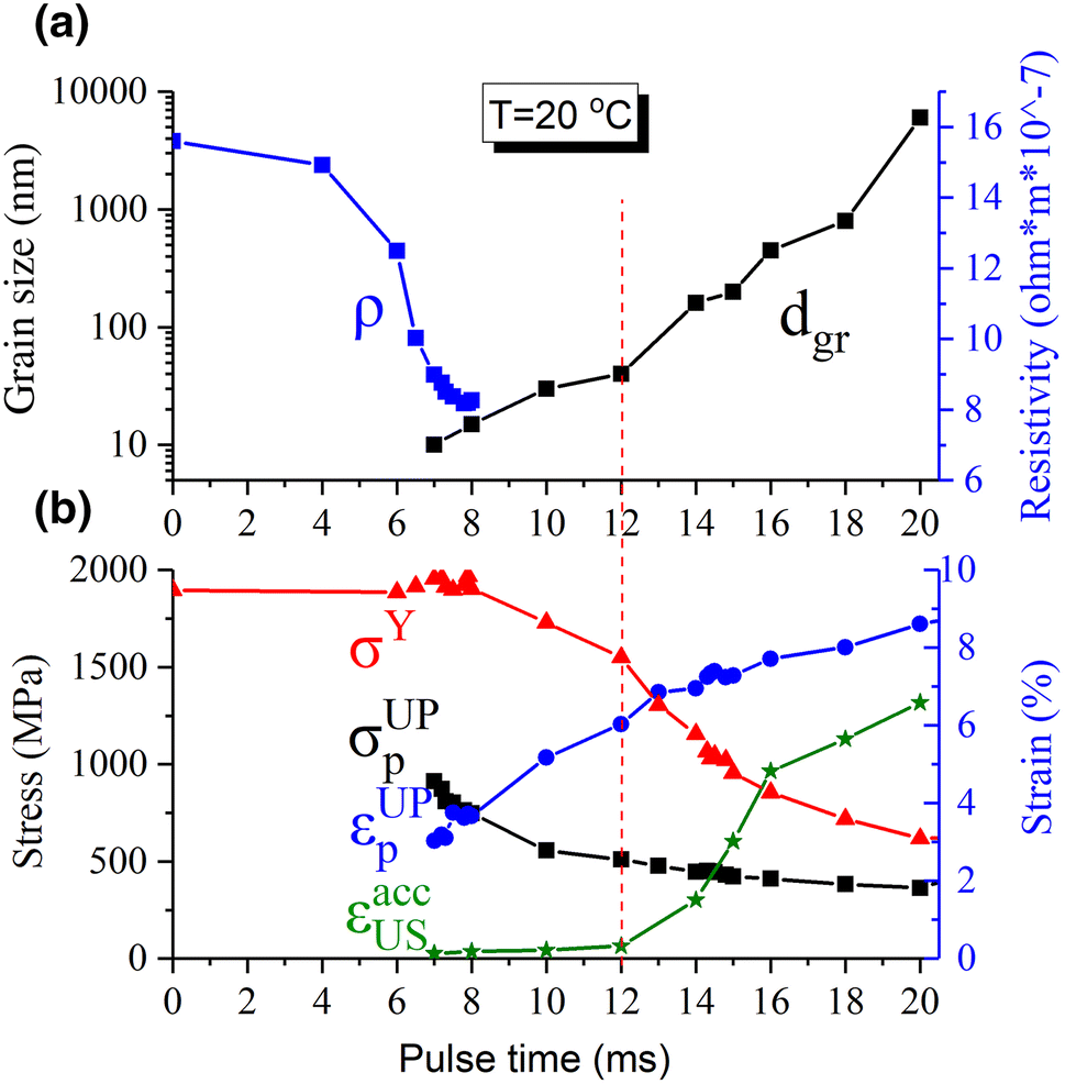 Finally, it shall be pointed out that the effects of grain size, density of lattice defects, texture, precipitates, inclusions, and internal stresses characterizing the microstructure of a specific NiTi wire on mechanical and functional properties of the wire are interrelated. One can investigate effect of one of the characteristics provided that the other remains constant. Since this is not the case in present experiments (Fig. 2b), we prefer to characterize wire microstructures by the pulse times and not by e.g., grain size, as frequently reported in the literature.