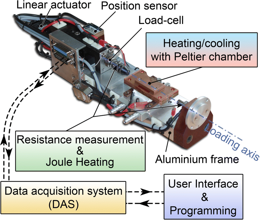 Thermomechanical tester MITTER with highlighted key components featuring 450 N load cell, stepper motor, position encoder, environmental chamber, electrically conductive grips, and closed-loop LabView based control system
