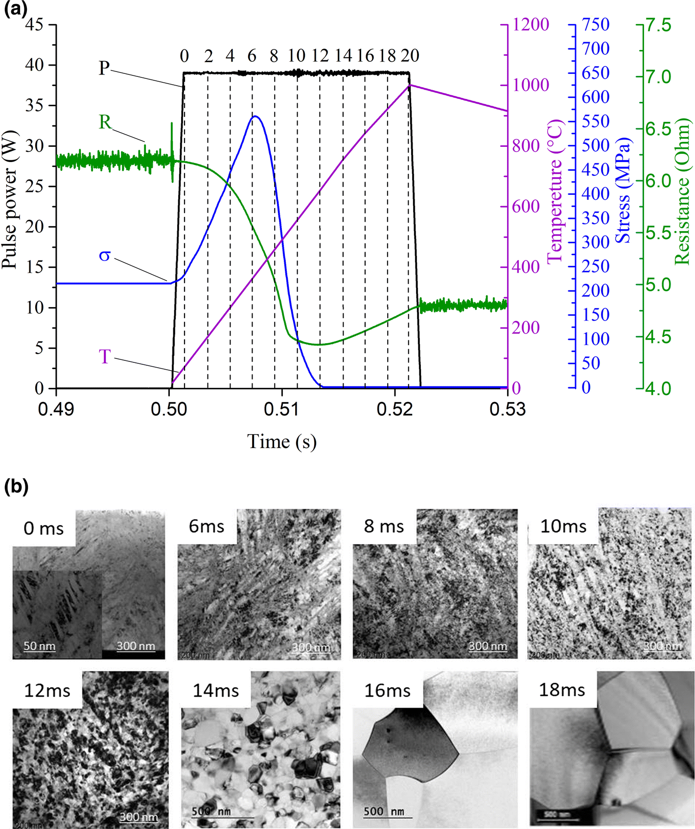 a Electropulse heat treatment of a cold worked NiTi wire. Variation of the temperature T, tensile stress σ and electric resistance R of the wire preloaded to 200 MPa during the application of a pulse of constant electric power P = 37.8 W for pulse time t = 20 ms to 30 mm long wire. b Microstructures observed by TEM in selected NiTi wires heat treated by electric power pulses of various times. The noise on the electric resistance signal appears when prior and after the power pulse since only 3 mA current is applied out of the pulse in order not to heat the wire