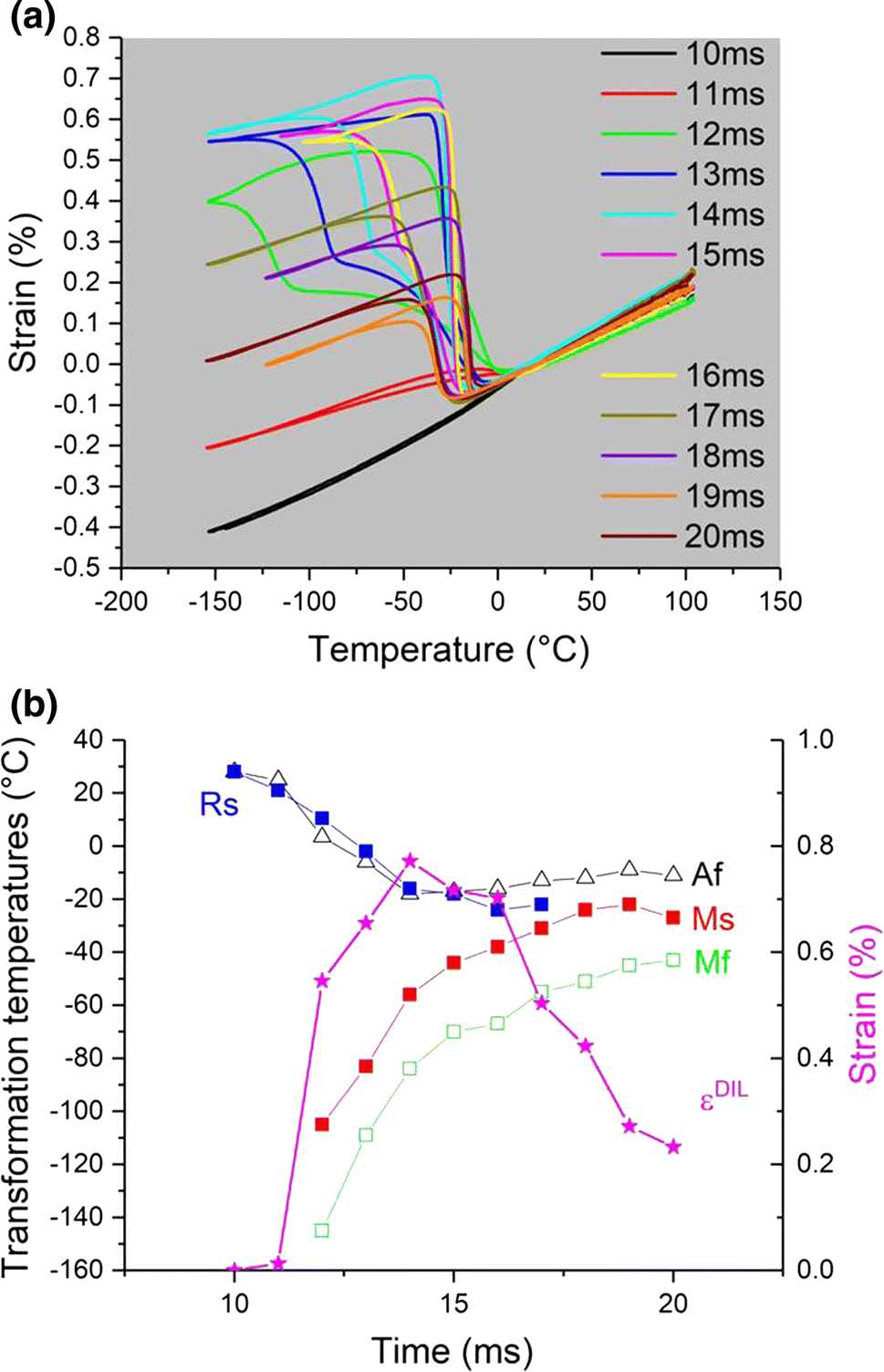 Transformation temperatures of the wire (Rs, Ms, Mf, Af) were evaluated by cooling/heating dilatometry experiments (Fig. 4). Transformation temperatures of the alloy in the fully annealed state (20 ms wire) were determined as Ms = − 25 °C, Mf = − 38 °C and Af = − 10 °C. Cold work and short pulse annealing (below 11 ms) shifts the Ms temperature below the dilatometer’s temperature range limit − 150 °C. The Ms temperature gradually increases with increasing pulse time up to − 25 °C for 20 ms wire (Fig. 4b). R-phase appears in 8–16 ms wires and the Rs temperature decreases linearly with increasing pulse time until it reaches the Ms temperature and does not appear anymore. It is interesting to note that the 12–16 ms wires develop significant tensile strain upon cooling under 13 MPa stress. This strain appears when the B2 austenite transforms to the R-phase as well as while it is being cooled within the R-phase state. It sums up with the tensile strain due to the R-B19′ transformation. We assume that this deformation appearing spontaneously under very low stress is due to an internal stress persisting in the microstructure of 0–17 ms wires in combination with the R-phase appearing in 12–16 ms wires (Fig. 4b). The dilatometry experiments thus, in addition to the determination of the phase transformation temperatures, bring additional information on the microstructure (internal stress) of heat treated wires. However, these phenomena were not further investigated in this work.
