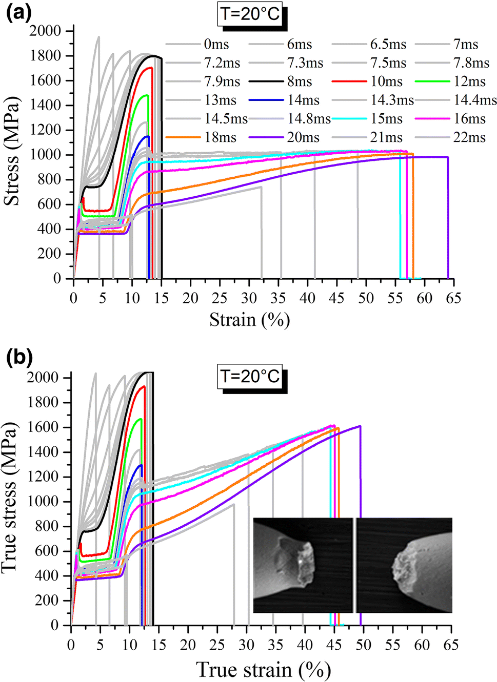 Results of tensile tests until rupture at room temperature on heat treated NiTi wires having various microstructures (pulse time 0–22 ms) are presented as engineering stress-engineering strain curves (Fig. 5a) and true stress-true strain curves (Fig. 5b). Stress–strain curves of wires selected for systematic tensile testing in wide temperature range are in bold and colored (pulse times (8, 10, 12, 14, 15, 16, 18, 20) ms). It is well known, that tensile deformation of NiTi wires in the plateau range is localized in macroscopic interfaces—martensite band fronts propagating at constant force along the wire and converting the austenitic microstructure into the presumably martensitic microstructure within the martensite band [14]. It is much less known that these wires fail by strain localization in necks. The necking was observed in tensile tests to precede the fracture of the wire at ~ 13% strains (pulse times < 14 ms) as well as at ~ 50% strain (pulse times > 5 ms) (Fig. 5). To demonstrate the necking deformation preceding the fracture of the wires, SEM pictures of the 14 ms wire fractured at 12.8% strain were inserted into Fig. 5b.