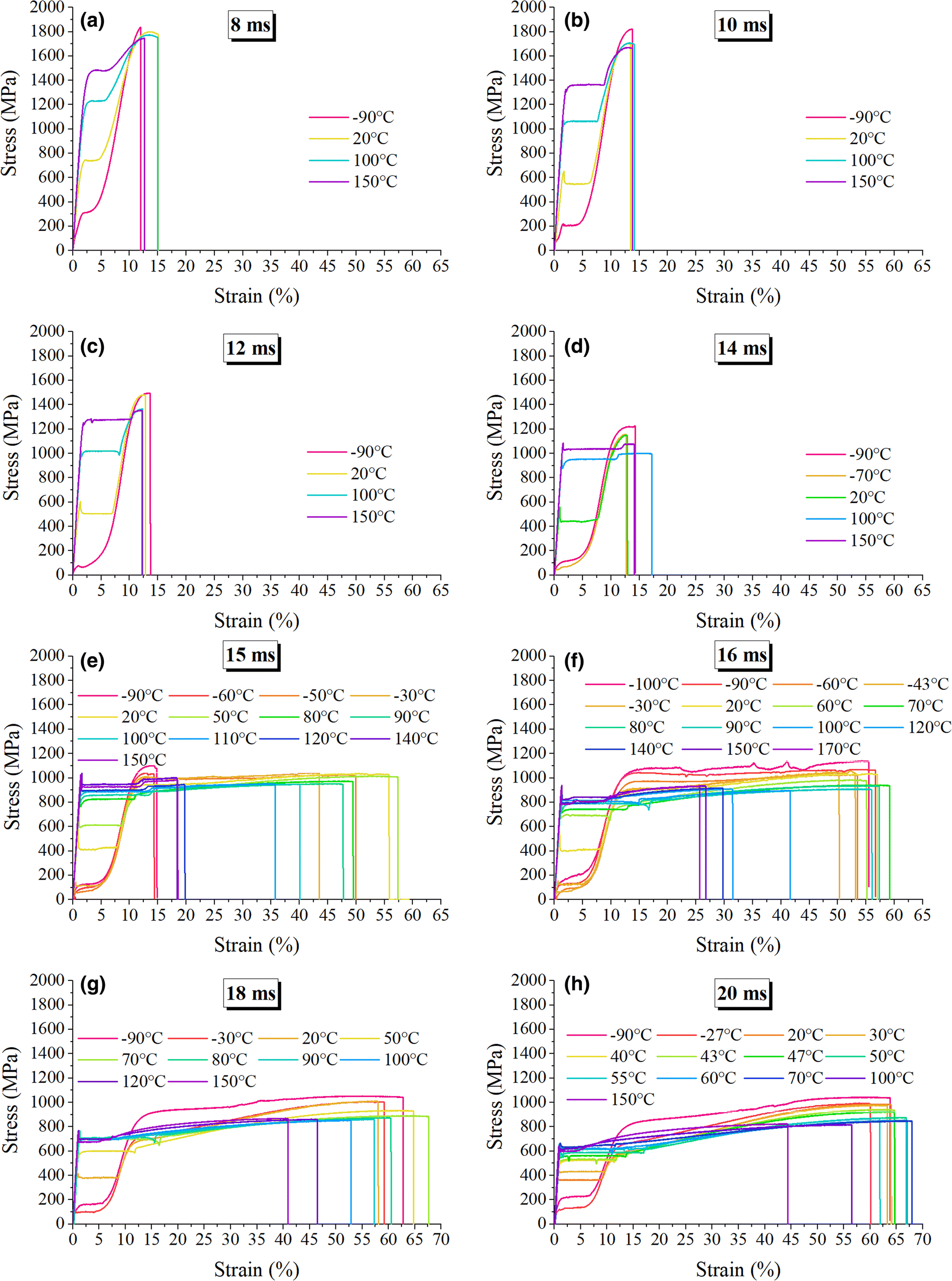 Stress–strain curves recorded in tensile tests until rupture at various test temperatures on NiTi wires with different microstructures denoted by pulse times (8, 10, 12, 14, 15, 16, 18, 20) ms (Color figure online)