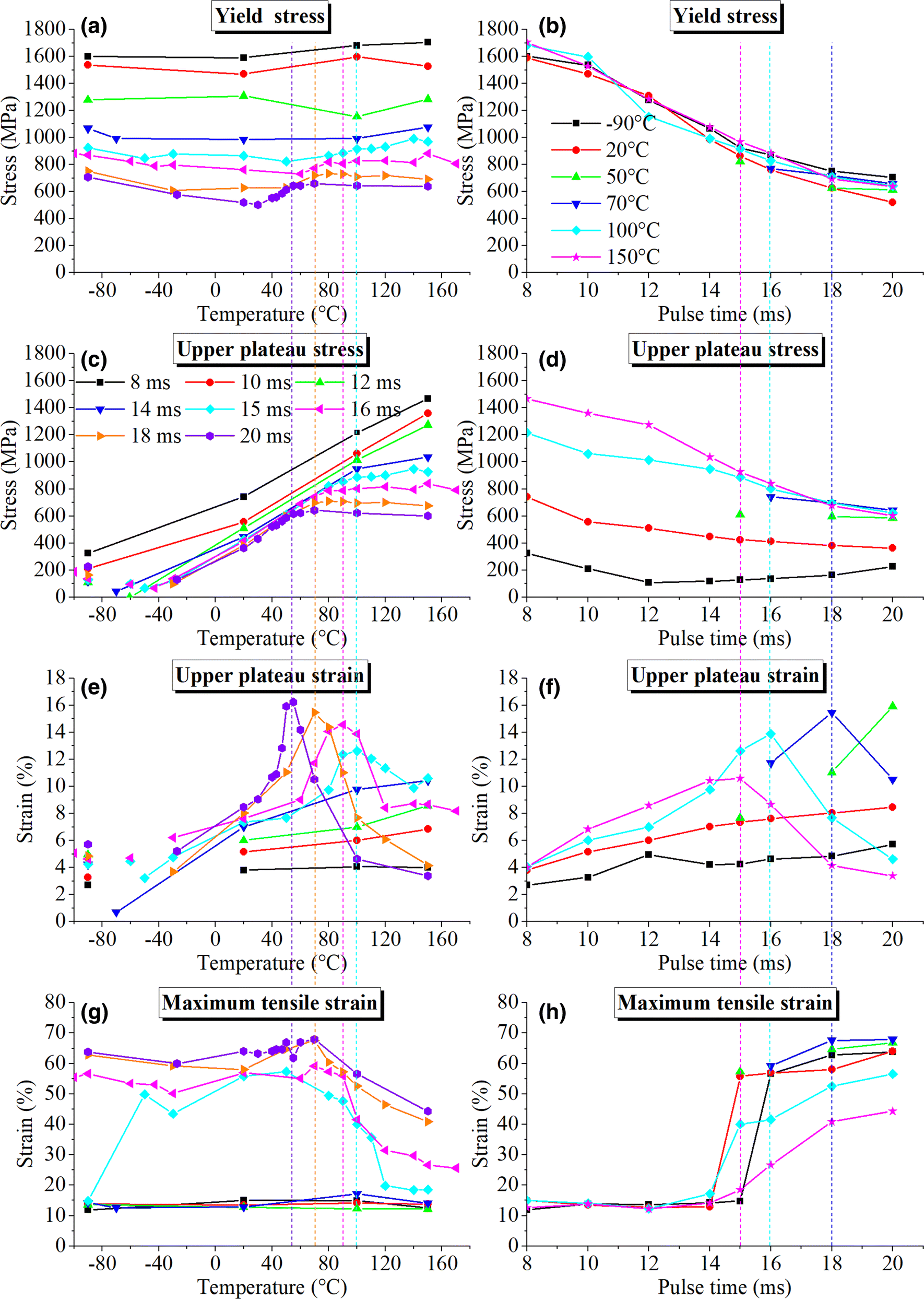 Temperature and microstructure (pulse time) dependence of material parameters determined from tensile tests until rupture: yield stress (a, b), upper plateau stress (c, d), upper plateau strain (e, f) and maximum tensile strain (g, h)