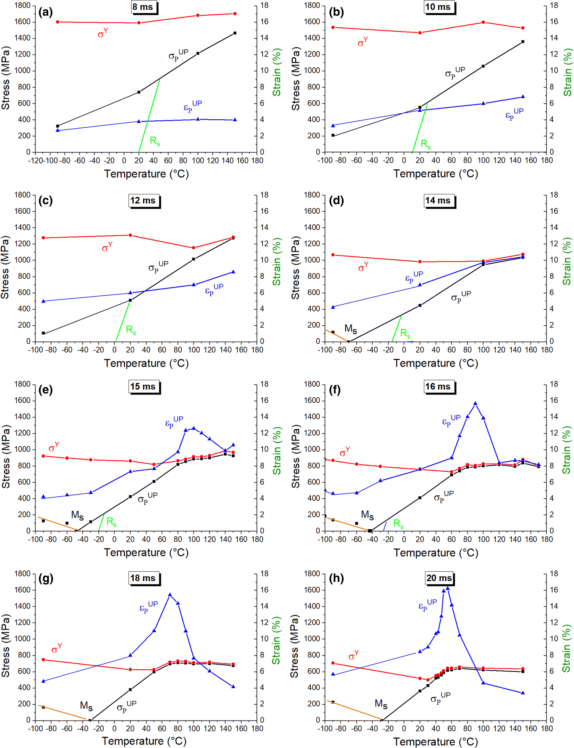 Figure 8 presents those results in a form of stress-temperature diagrams with superimposed upper plateau strains for all studied microstructures. From those diagrams, it becomes very clear that the temperature dependencies of the upper plateau strains show pronounced maxima at temperatures, at which the increasing upper plateau stress reaches the yield stress. Since this tends to happen at lower temperatures in wires heat treated with longer pulse times, the plateau strain maxima occur at ~ 160 °C in case of 14 ms wire but at 60 °C in case of 20 ms wire.