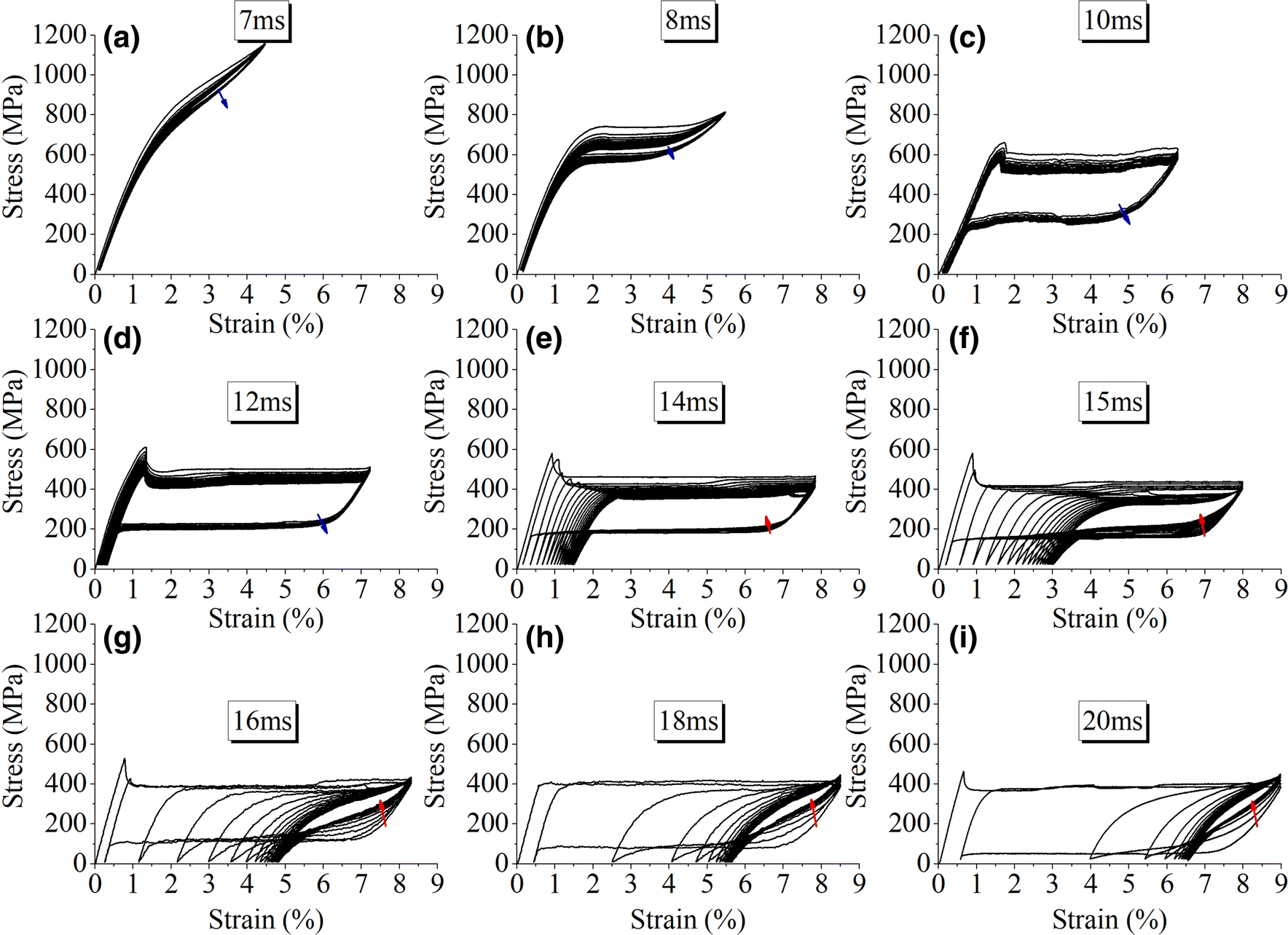 The cyclic superelastic responses of 7–12 ms wires (Fig. 9) are relatively stable. The magnitude of the upper plateau strain and area of the hysteretic loop increase with increasing pulse time due to gradually increasing involvement of the stress induced martensitic transformation upon cycling. In the 14–20 ms wires, the plateau strain further increases with increasing pulse time but the cyclic stress–strain response becomes gradually unstable so that the area of the hysteretic loop and transformation strain decreases upon cycling.