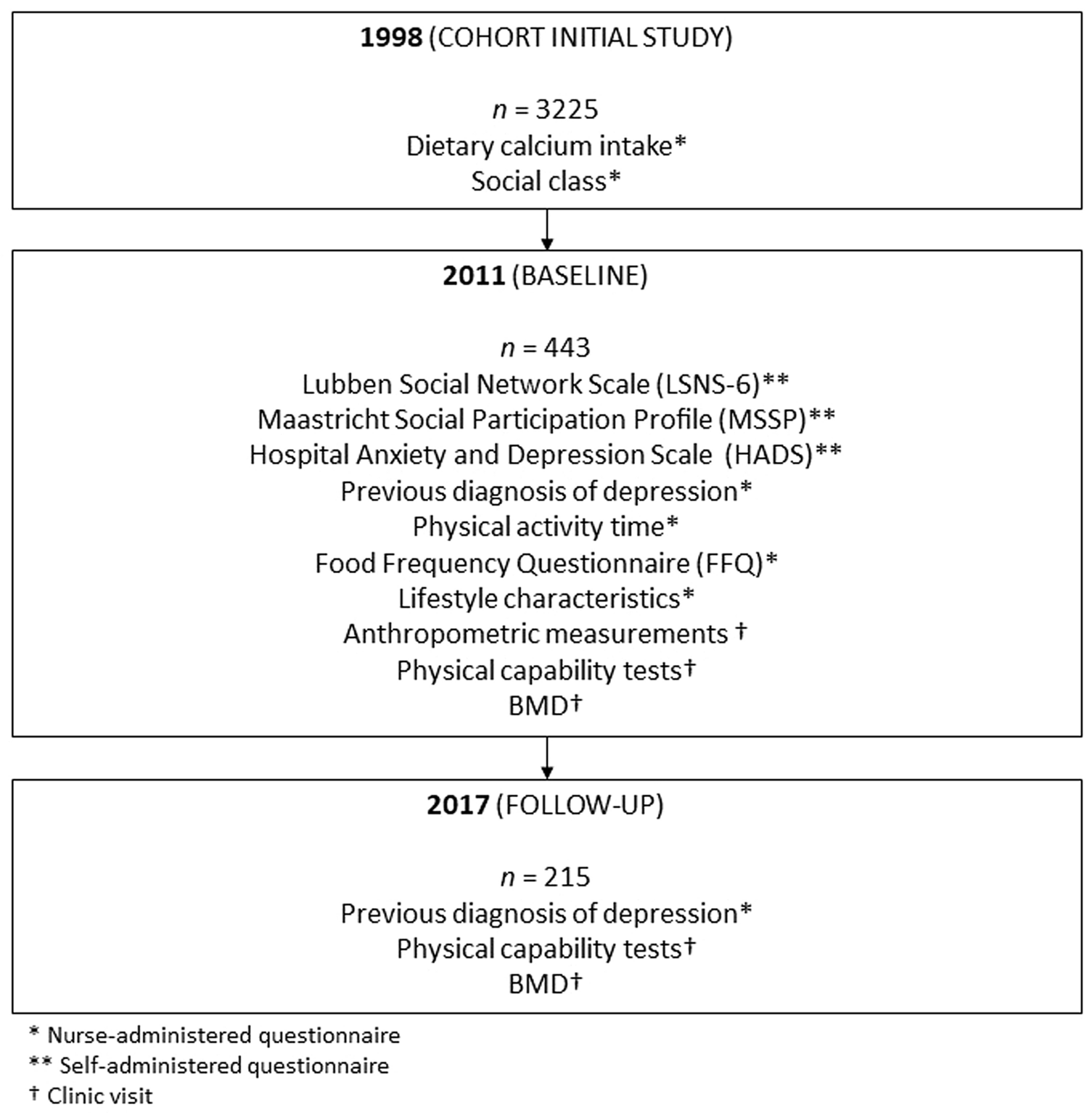 The Hertfordshire Cohort Study was established in 1998 [19, 20]. In 2011, having provided written informed consent, 443 HCS participants (222 men and 221 women) who had formed part of the initial cohort and who were selected based on geographic location (East Hertfordshire) only were visited at home by a trained fieldworker, when a questionnaire was completed. The visits also included measurements of height and weight to calculate body mass index (BMI) and the performance of a number of physical capability tests. A previous diagnosis of depression was self-reported, both at baseline and follow-up, and assessed asking the question: ‘Have you been told by a doctor that you have any of the following conditions?’, with depression being one of the conditions recorded. Participants were also invited to attend a research clinic where BMD was assessed using a dual X-ray absorptiometry (DXA) scan. In 2017, 215 participants (112 men and 103 women) of this original group were invited to participate in a follow-up study and re-attended for a further DXA scan and physical capability tests.