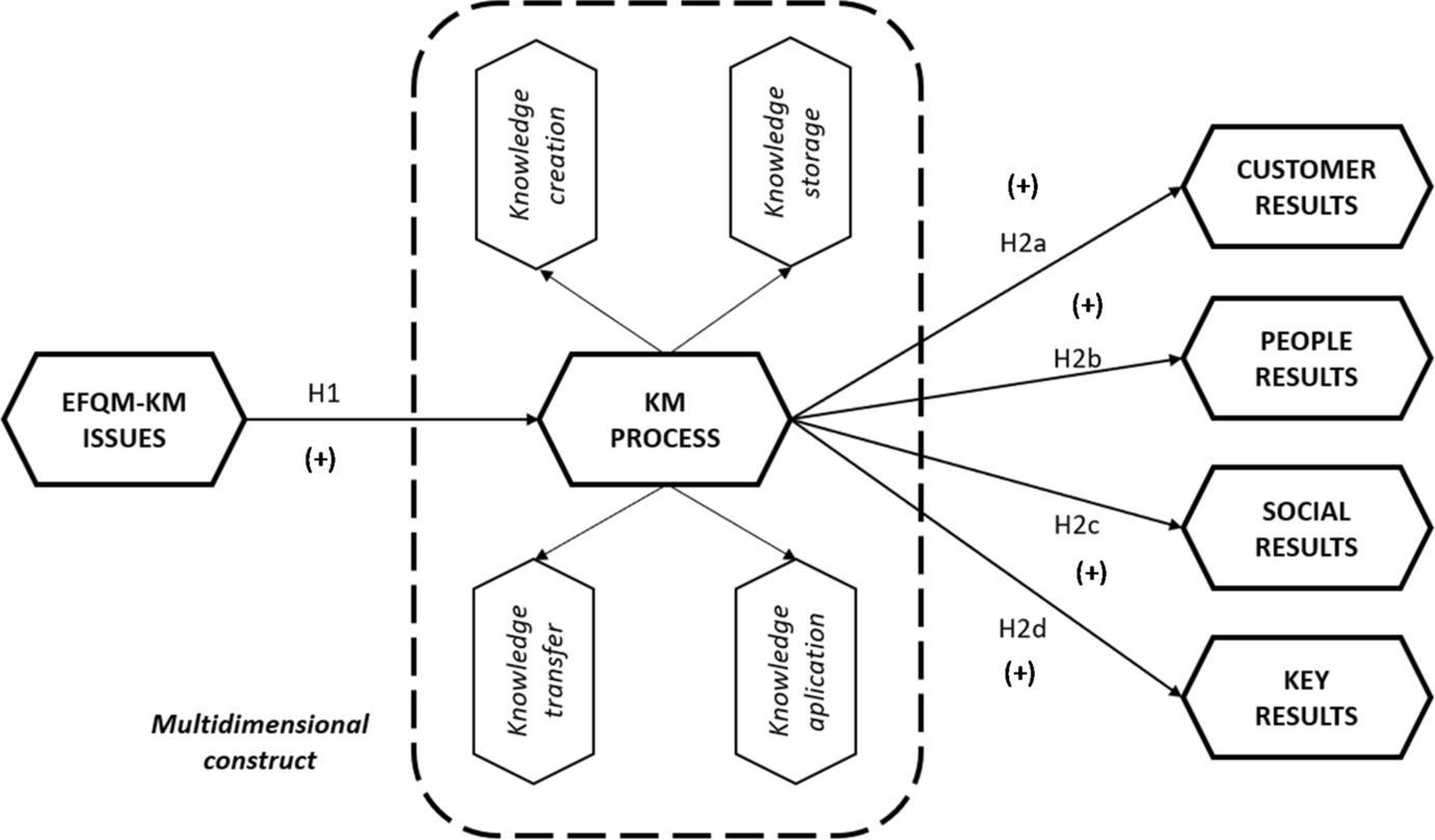 A great deal of the knowledge that the organisation possesses at the individual and collective levels is formalized in the organisation's processes. In this sense, it is necessary to attempt to identify and measure this explicit knowledge since it is fundamental to the correct development of the KM process (Alavi and Leidner 2001). In addition, self-assessment using the EM facilitates the localisation of tacit or nonformalized knowledge. This methodology allows us to deepen our understanding of the internal management of an organisation, the compartments of the people in the organisation and the various types of resources that it uses (Calvo-Mora et al. 2015). Subsequently, taking into account the characteristics of the environment and key factors associated with the sector in which the organisation operates, it is necessary to identify and obtain information regarding the knowledge, skills and attitudes needed to compete in this arena (Ju et al. 2006). For Abbas (2020), this information can be obtained from the partners and stakeholders with whom the organisation interacts. The implementation of the EM facilitates contact and exchanges of information with partners and stakeholders. This process also facilitates the sharing of experiences and knowledge, thus making relationships more beneficial for all (Calvo-Mora et al. 2016). Now, the organisation can determine its knowledge deficit and consider the best way of filling this gap through knowledge generation or creation.