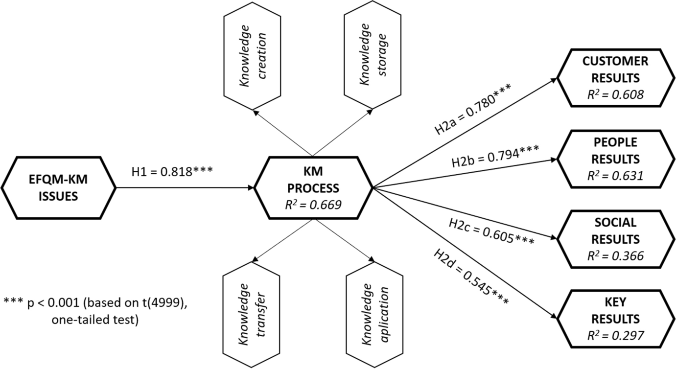 The results show that the proposed research model is reliable and valid (Table 5). All hypothesised relationships (H1, H2a, H2b, H2c and H2d) or direct effects posited in the research model are also confirmed at high levels of significance (Table 7 and Fig. 2). More specifically, the positive relationship between the EFQM-KM issue and the KM process (0.818) is corroborated, i.e., the implementation of the EM and the development of both self-assessment and external evaluation processes favour the effective and efficient development of the phases of the KM process. Along these lines, Abbas (2020) and Loke et al. (2012) argue that organisations that implement total quality management (TQM) principles and practices (leadership, strategic planning, human resource management or customer orientation) promote higher value KM activities and a greater level of learning. Ooi (2014) finds that certain TQM practices, such as strategic planning and human resources management, impact KM positively. Honarpour et al. (2017) and Hung et al. (2010) defend the synergistic effect of the relationship between TQM and KM. With regard to our study framework, Criado-García et al. (2020) demonstrate that KM can be developed efficiently through the systematic application of the EM. Quintana and Benavides (2005) investigate the facilitator and outcome criteria of the EM and establish connections with the KM process. Martín‐Castilla and Rodríguez‐Ruiz (2008) consider the EM to be a strategic framework that facilitates the governance of organisational knowledge via the integration of intellectual capital. Our work empirically demonstrates this positive relationship and elaborates on it through the phases of KM, reducing the research gap in this field.