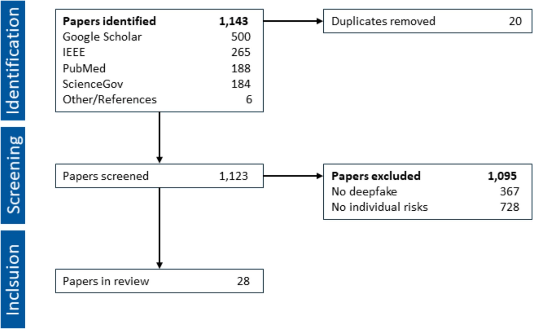 Findings will be presented by categorizing included papers into the five categories. A total of 28 papers were included in the scoping review (Table 1). Papers were divided into five categories: concerns and attitudes (5 papers), consequences of deception (10 papers), harm on mind and behavior (4 papers), hypothetical threats (7 papers), and trust (4 papers). The papers focusing on concerns and attitudes show that awareness and concerns about deepfakes were widespread across international samples, and that deepfake misuse was considered harmful. Papers focusing on consequences of deepfake deception found that successful deception by deepfakes can cause sharing of deepfakes across social media, changes in attitudes, false memories, or bad financial choices. Papers focusing on harm on mind and behavior found that having deepfakes revealed can decrease self-efficacy and cause distress; furthermore, victims of deepfake pornography show symptoms of distress and trauma. Hypothetical papers present hypothetical threats of deepfakes across a variety of sectors, such as education, the marketplace, or healthcare. Finally, papers focusing on trust shows that exposure to or awareness of deepfakes can lead to a distrust towards media in general.
