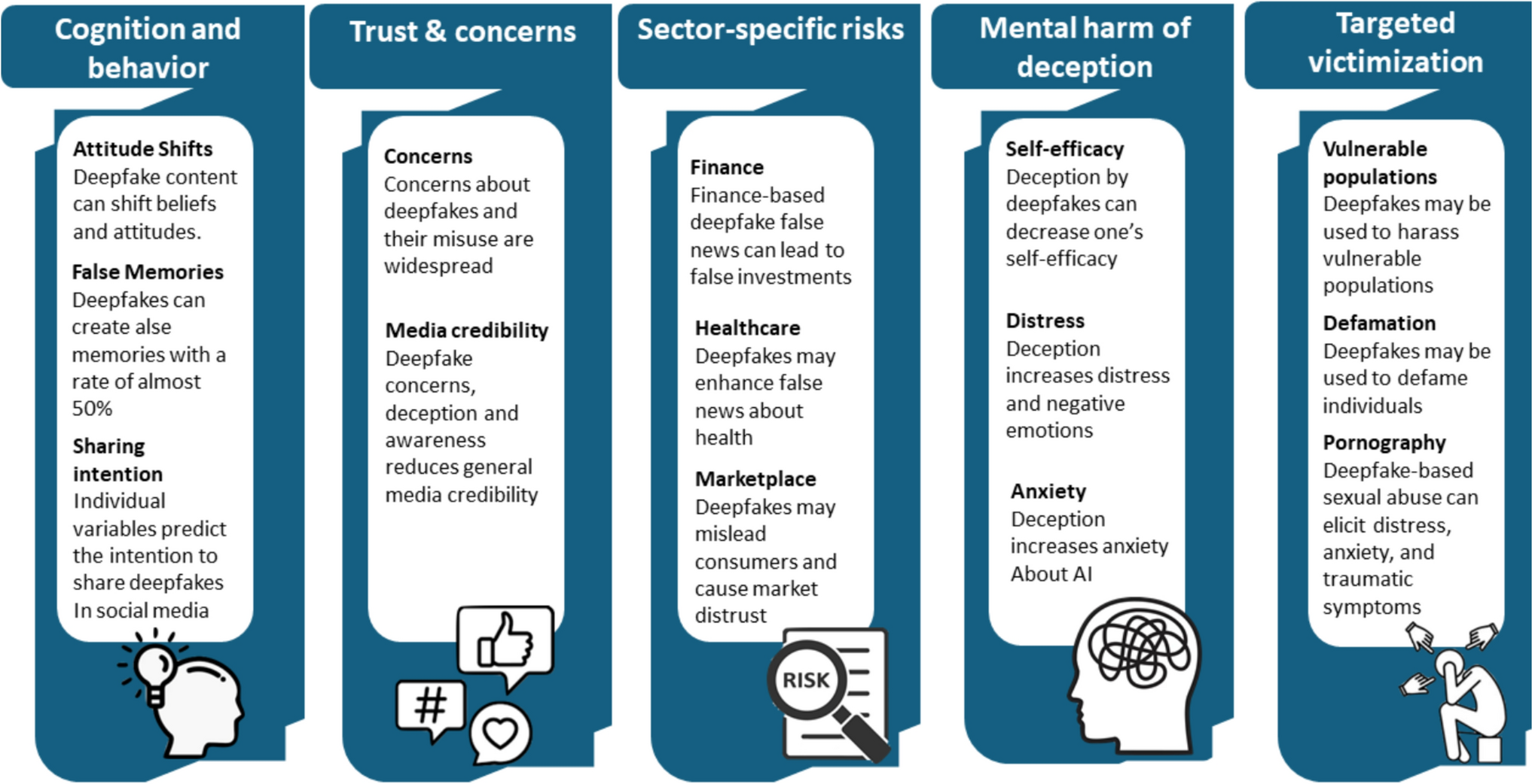Seven papers focused on hypothetical or predicted harm caused by deepfake (Abdulai 2025; Bakir et al. 2024; Lundberg et al. 2025; Martinez et al. 2024; Mustak et al. 2023; Rini and Cohen 2022; Roe et al. 2024). Four of these papers focused on the risk of deepfakes in certain settings or contexts, such as healthcare (Martinez et al. 2024), entertainment (Lundberg et al. 2025), marketplace (Mustak et al. 2023), or education (Roe et al. 2024). One paper focused on emotional manipulation by AI (Bakir et al. 2024), one paper on the dangers of AI for vulnerable populations (Abdulai 2025), and one paper on the potential dangers of deepfake victimization by impersonation or identity theft, especially in the context of deepfake IBSA (Rini and Cohen 2022).