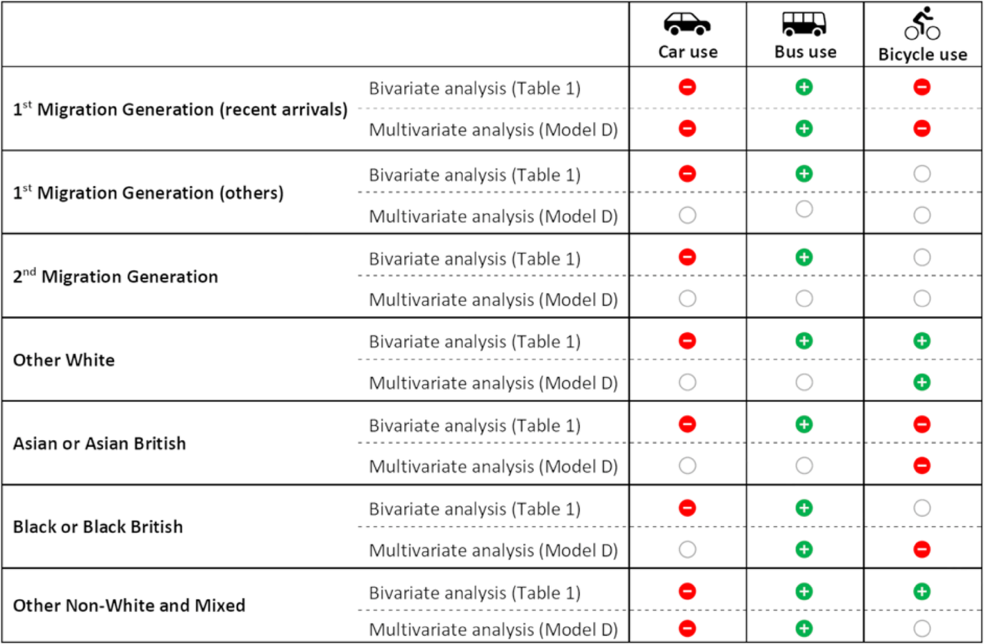 In this paper, we investigated car, bus and bicycle use frequency in England, focusing on differences associated with migration background and ethnic group identification, and investigating to what extent these associations are accounted for by other factors. We summarise the main associations identified in the bi- and multivariate analyses in Fig. 1. Note that in the figure, the findings for the multivariate analysis refer to Model D in Tables 2–4, not Model E. This is explained as follows: we consider that car and driver licence ownership potentially act as mediating factors between our main independent variables of interest (ethnicity and migration background) and the outcomes of interest (mode use frequency). This implies that, in the fully adjusted models that controls for car and driver licence ownership (Model E), the coefficients for ethnicity and migration background are an underestimate of the true effects of these variables, part of which is direct, and part of which is indirect (i.e., mediated by car and driver licence ownership, which in turn influences mode choice). As such, we believe that the coefficients from Model D provide a better reference for estimating the impact of ethnicity and migration background on mode use frequency.
