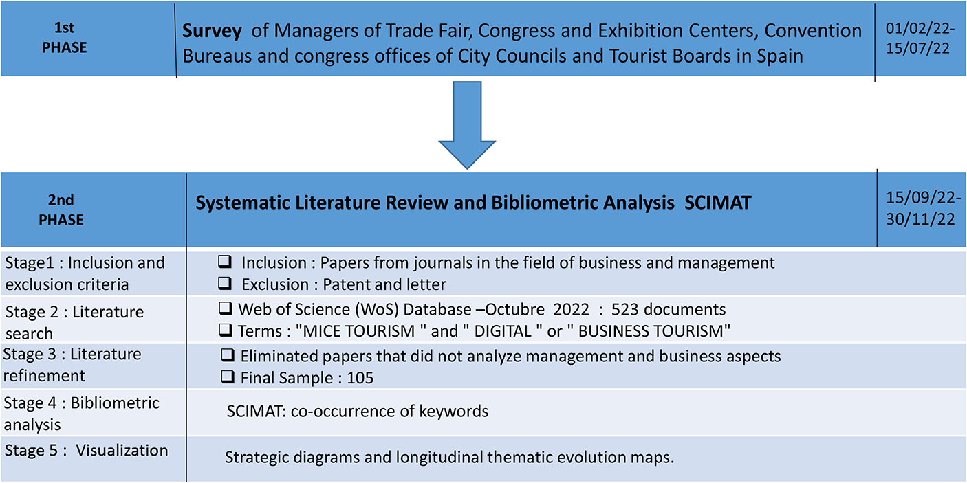 The innovation and contribution of this research lies in its bibliometric analysis on MICE tourism and digitalization since according to the Web of Science (WoS) database advanced search conducted on October 10, 2022 by entering the terms “MICE TOURISM”, “DIGITAL” and “BUSINESS TOURISM”, there is only one article that carries out a review of the existing literature in the period 2000–2019, just before the COVID-19 pandemic (Zazueta and Velarde: “Research on Meeting Tourism in the period from 2000–2019: A literature review”, in Pasos-Revista de Turismo y Patrimonio Cultural 20(3), July-September 2022). Furthermore, based on the bibliometric analysis (a total of 105 papers from 1997 to 2022 were obtained for this analysis) and the surveys carried out, it is possible to identify new trends in MICE tourism after the pandemic to design new business management models that adapt to this new reality in future lines of research.