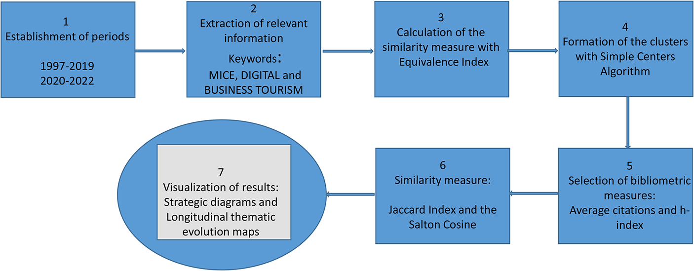 The objective of this second phase was to map the state of the art in MICE tourism and to identify the research topics of greatest interest to improve the competitiveness of this type of tourism by adapting its management to new changes in the environment. For this purpose, a systematic review of the existing literature (Kraus et al. 2020; Bouncken et al. 2015), was combined with a bibliometric network analysis to determine which documents should be included (Holzschuh et al. 2022).
