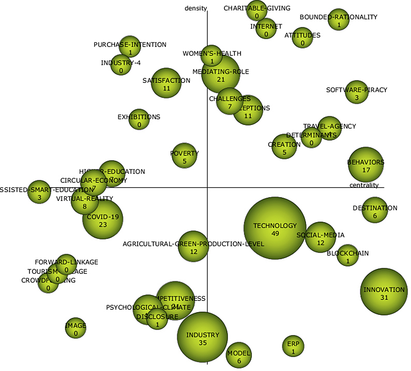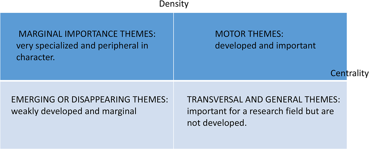 Strategy maps: these are presented as an open 2 × 2 matrix where four possible themes are represented depending on the quadrant where the cluster is located, together with the parameters of “density” and “centrality”, as shown in Fig. 3.