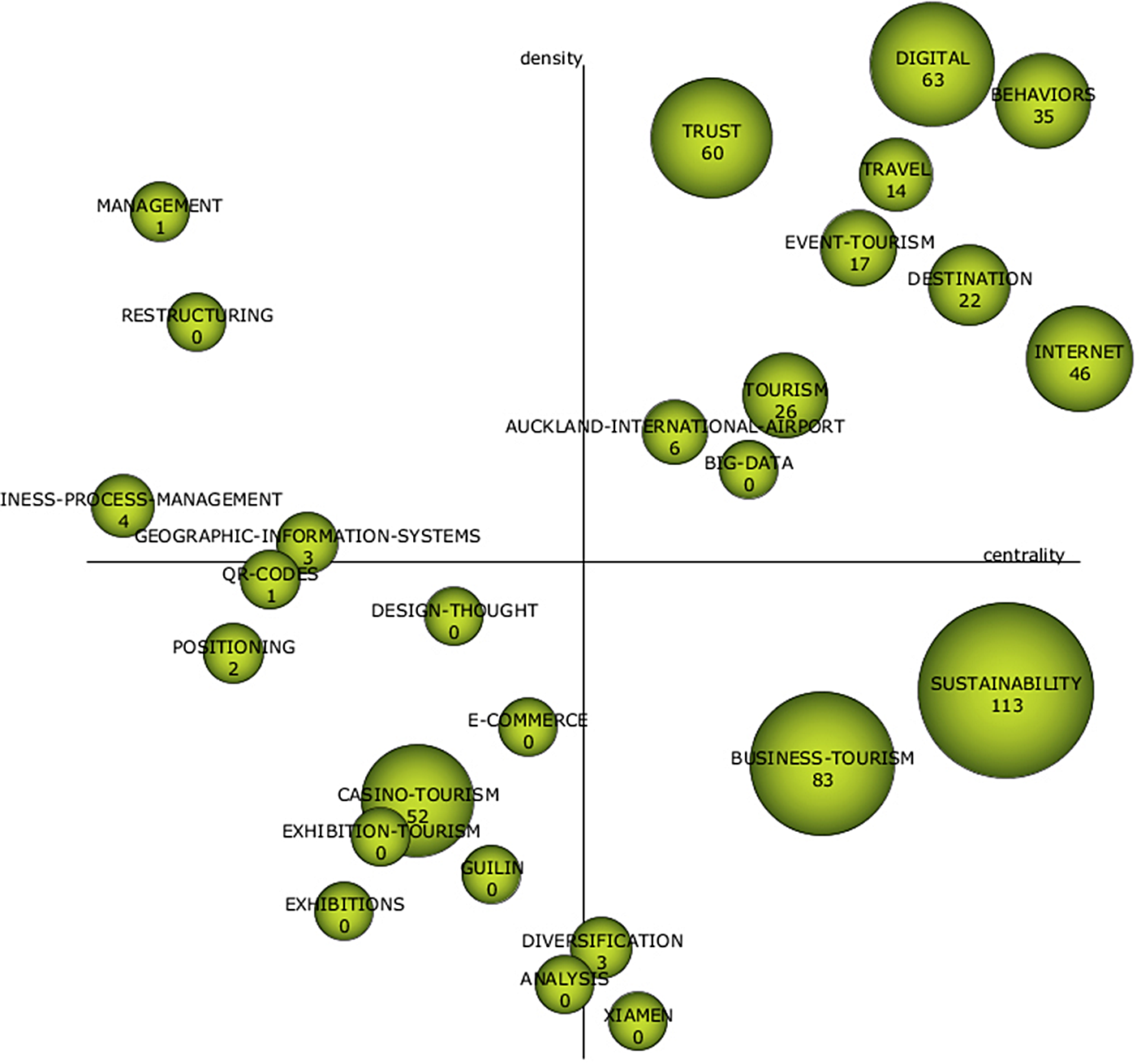 In the pre-pandemic period (1997–2019): 46% of the documents belong to this period. We must highlight that “digital business transformation”, “experience”, “tourism”, and “event tourism” were among the most developed topics, which are issues that have driven research during this period. However, there is also a great interest in other less developed but significant and transversal topics that could be studied in future research, such as sustainability (Fig. 5).
