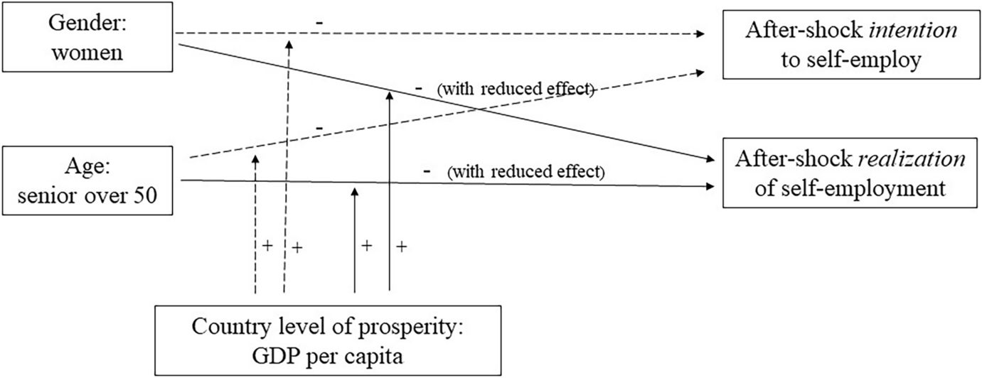 To address this glaring gap in the literature, we undertake an under-explored view of disruption in the external context and investigate how crises affect the intention and realization of self-employment of vulnerable people across different places. To truly understand why some people are more resilient than others, we must consider the unique circumstances of each crisis, as well as the personal characteristics of those considering self-employment. It is important to recognize that the likelihood of someone pursuing self-employment can vary greatly based on specific moments, locations, and demographic groups. Failing to account for these factors can lead to a limited understanding of the motivations and challenges faced by potential self-employees (Quintillán & Peña-Legazkue, 2020). Abrupt shake-outs influence differently distinct segments of (aspiring) entrepreneurs, and to the best of our knowledge, research to date has not investigated enough this “persona causa” behind these processes (Hessels et al., 2011). Thereby, this investigation undertakes a more nuanced approach to investigate resilient entrepreneurial behavior by considering the effect of recent shocks (i.e., the global financial crisis, hereafter GFC, and the coronavirus crisis, COVID-19 hereafter) on people who live in dissimilar socioeconomic environments and face different sorts of vulnerability (i.e., gender-related and age-related vulnerability).