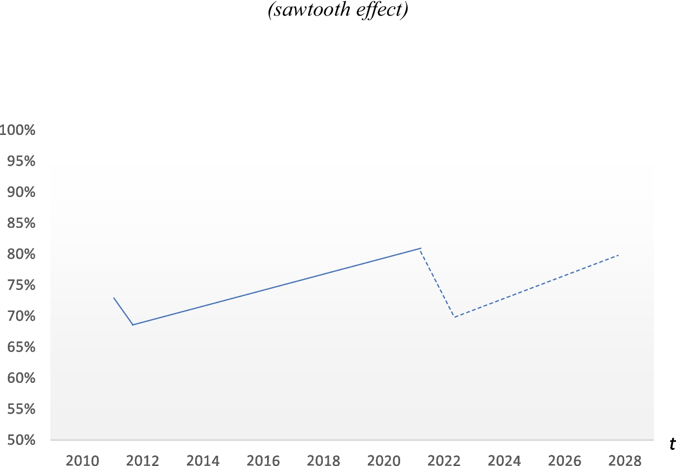 It is well known that the context is important for understanding when, how, where, and why entrepreneurship happens and who becomes involved (Giménez & Calabró, 2018; Welter, 2011). The level of wealth in different locations largely explains the variation in desirability and feasibility of self-employment, as context shapes entrepreneurial intentions and attitudes (Zhu et al., 2021). Recent studies on inequality and entrepreneurial thresholds suggest that a country's uneven wealth distribution affects the availability of resources and opportunities, which can influence the success of aspiring entrepreneurs (Constantinidis et al., 2019; Sarkar et al., 2018). Our findings show that the after-shock resilient behavior of women and seniors is enhanced in more prosperous places. It is well known that differences in markets, institutions, and wealth levels in countries have significant implications for economic inequality (Brutton et al., 2021) and also for gender and age disparity in self-employment. We contribute to the literature on economic development and entrepreneurship by arguing that the recovery from any crisis is typically unequal, with economically disadvantaged groups and emerging economies needing much more time and support to recover from each shock (i.e., what we call augmented vulnerability). The most recent historical evidence indicates that self-employment gender and age gaps tend to converge towards parity through cycles, with sudden drops occurring at shocks and gradual improvements taking place over longer periods. A new disruptive event has the potential to undo the institutional efforts made to promote gender and age parity. That is, abrupt shocks can cause a “sawtooth effect”, leading to a severe reduction or complete elimination of the positive impacts of policies on parity implemented over many years, especially in less favored regions (See Fig. 2).