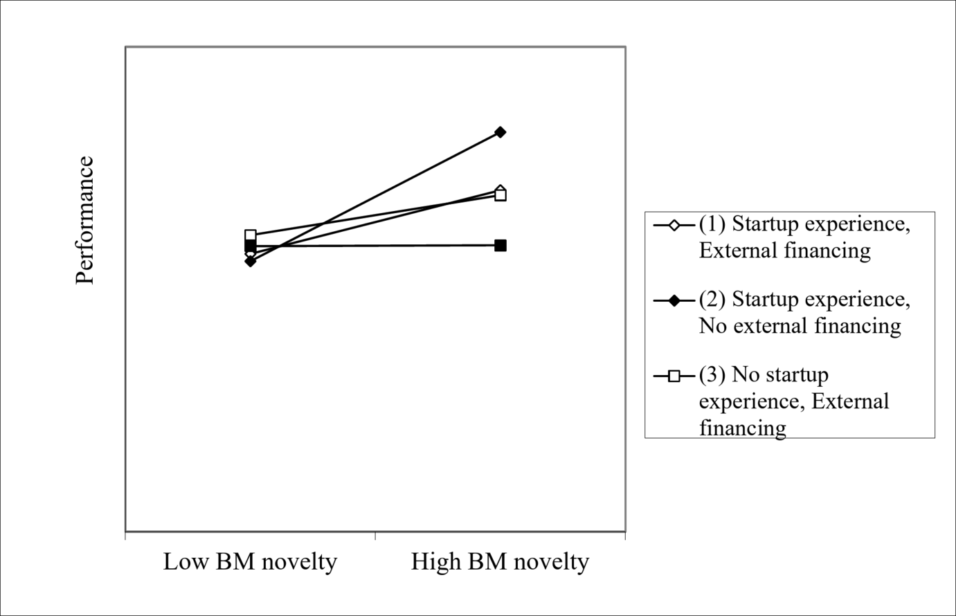 Looking at the two-way effects, previous start-up experience strengthens the performance of start-ups with a novelty-centred BM design. The three-way effects (Fig. 3) show that the impact of a business model design varies in line with the underlying resource situation. The nature of the interaction indicates that start-ups with a low degree of BM novelty perform less well regardless of start-up experience and the amount of external financial capital. However, the picture looks different in the case of a high degree of BM novelty. In the case of a novelty-centred BM, having no start-up experience and little or no external funding is the worst possible combination. Start-ups run by founders with previous start-up experience and less external financing yield the relatively best results.