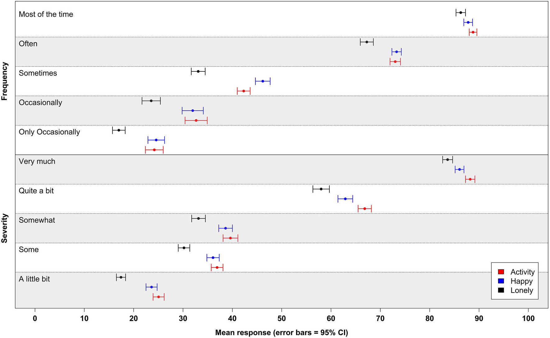 Second, they were asked to assign a set of randomly ordered severity response options (‘a little bit’, ‘somewhat’, ‘some’, ‘quite a bit’, ‘very much’) on a similar 0 to 100 slider scale (0 = not at all, 100 was undefined). In both cases, these questions related to the domain to which the participant had been randomised (e.g. loneliness). For the frequency slider the top anchor ‘all of the time’ is intuitive, however, there is no such clear top anchor for a severity scale, which can be applied across the three domains. The top of the severity scale was left undefined to avoid introducing potential focusing effects from terms that are not usually part of the response option set and also to allow respondents to place ‘very much’ at the top of the scale should they wish.