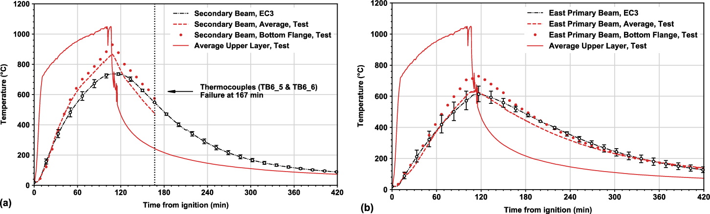 As detailed above, theoretically two analytical methods can be used to estimate temperatures of connection components: if the steel beam bottom flange temperature at midspan is known, then empirical Eqs. (1) and (2) can be employed directly; if the gas temperature within the compartment is known, then Eq. (3) can be used to estimate the steel beam temperature which is a main variable of Eqs. (1) and (2). The following section will examine those two methods, utilizing the experimental data to evaluate the applicability of the Eurocode 3 provisions.