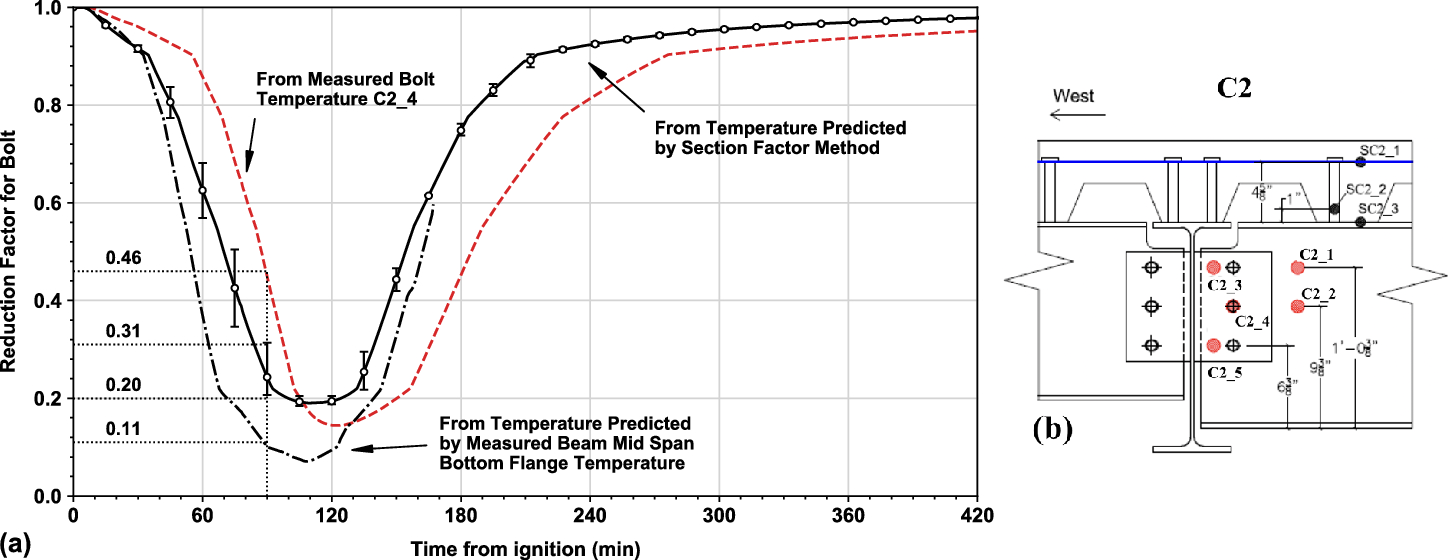 The bottom flange temperature of the west primary beam reached its measured maximum value of 760°C during heating, then the temperature decreased more gradually during cooling. The increase in the connection temperatures was slower than the beam temperature because the connection had a thicker SFRM layer than the beams. The maximum value of the connection temperature was recorded 540°C at C5_3. Temperatures of the bottom and middle bolts (C5_3 and C5_4, respectively) indicated higher component temperatures compared to those measured at bottom and top edges of welds (C5_6 and C5_7, respectively). This might be because the weld temperatures were affected by the thermal shadow effect due to column flanges, the heat conduction loss to the connected column web at this region, or both. Those relative relationships of temperatures were further evaluated using Eurocode 3 methods in the subsequent section.
