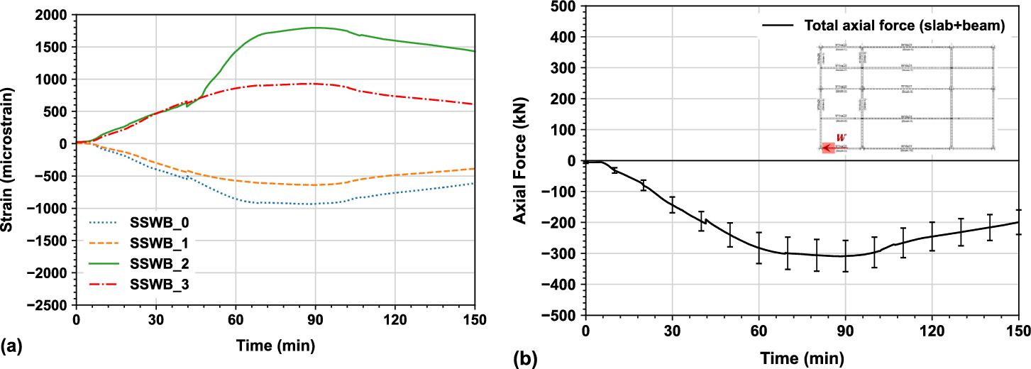 (a) Strains for SWB series, (b) Total axial force at the composite connection on SWB instrumented column in the south primary beam longitudinal direction (error bar was the standard deviation of four strain gauges’ measurements)