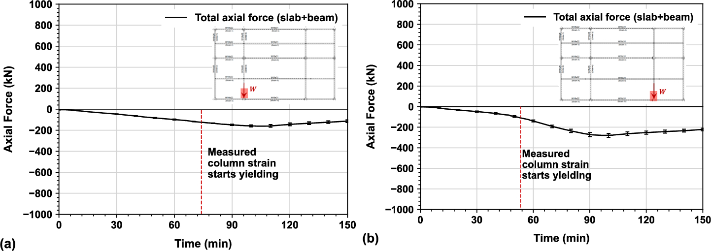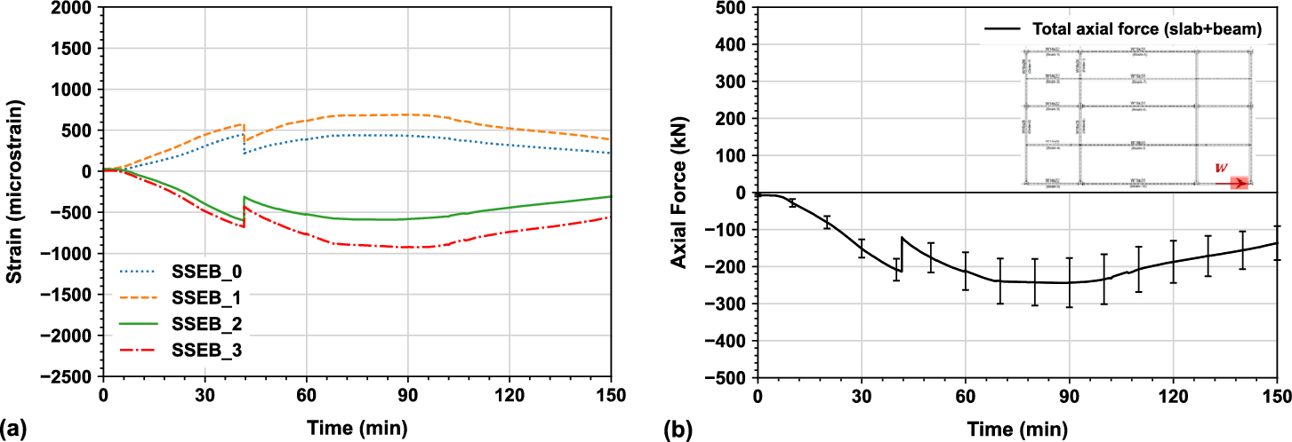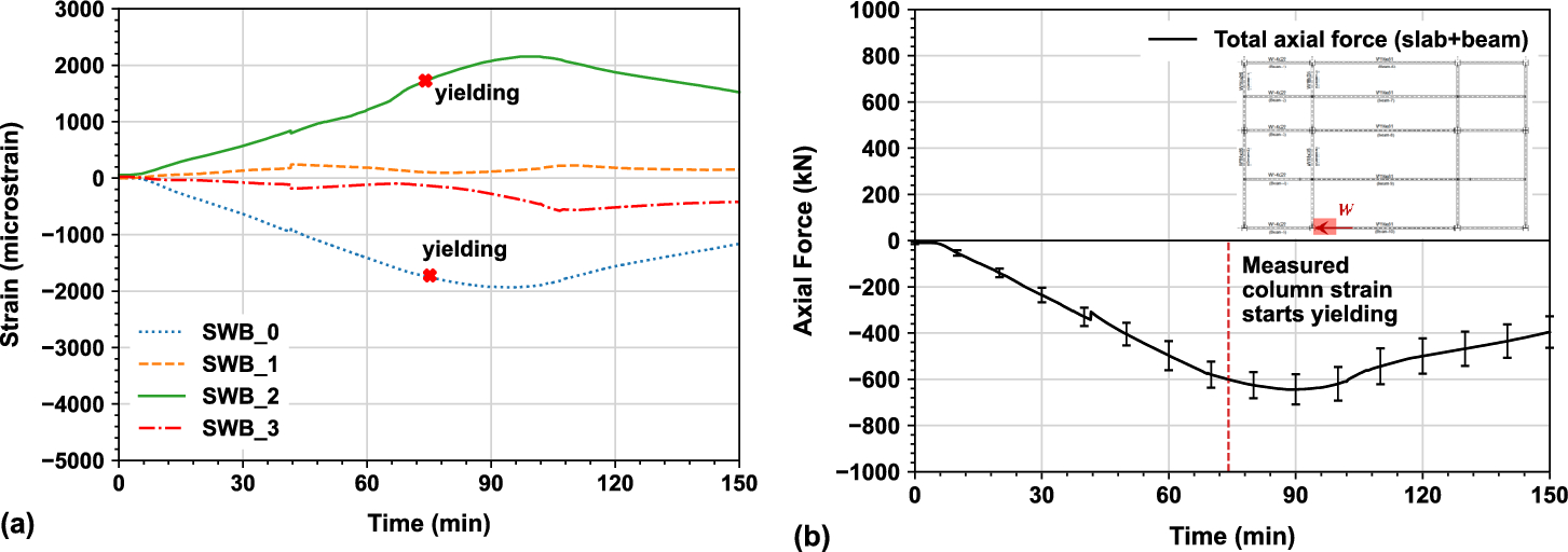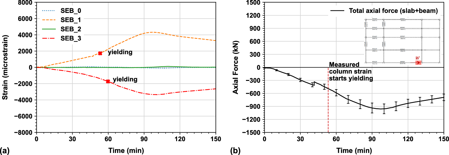 Hence, once measured strains are higher than the yield point of 1725 micro-strain (i.e., \(f_{y} /E = 345 MPa/200GPa\)), the interpreted axial forces may have become less valid. Note that both yield strength of 345 MPa and modulus of elasticity of 200 GPa for ASTM A992 [28] steel are minimum specified values rather than the measured values. The axial forces at the composite connections of the SWB and SEB instrumented columns in the south primary beam longitudinal direction, were 625 kN and 515 kN at 74 min and 53 min respectively, when the measured strains reached yielding. Both values were significantly higher than the axial forces at the composite connections at the surrounding bays presented in Sect. 5.4, because higher constraints for the south primary beam due to thermal expansion compared with the east or west surrounding bays having limited constraints for force distribution.