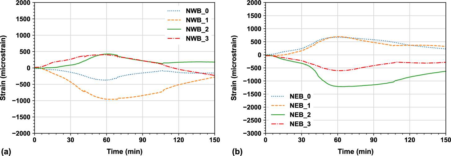The compressive axial forces at composite connections of the SNWB and SNEB instrumented columns reached their maximum of 155 kN and 185 kN respectively at around 70 min, which were 165 kN and 65 kN lower than the forces at the composite connections of the SSWB and SSEB instrumented columns respectively. Apart from the reason that the average temperature of the north primary beam reached above 600°C at 70 min (see Figure 9), i.e., more than half of its strength was not sustained, the other reason is likely because the higher restrained condition also caused local buckling of the connected north beam in the test bay, which appeared to happen around 60 min, at peak strains of NWB and NEB (see Figure 19). In addition, slab integrity failure with center cracks appeared at south of the secondary beam was also identified at around 70 min.