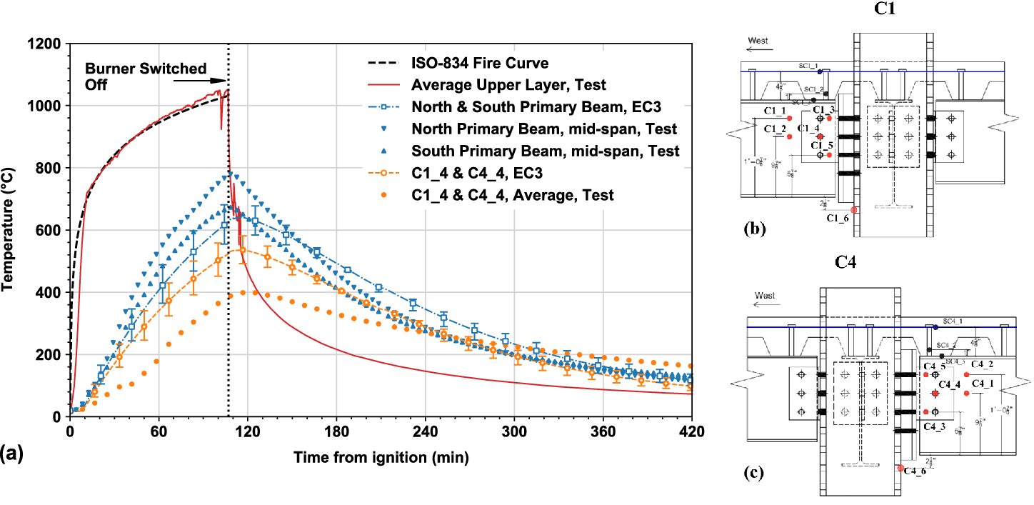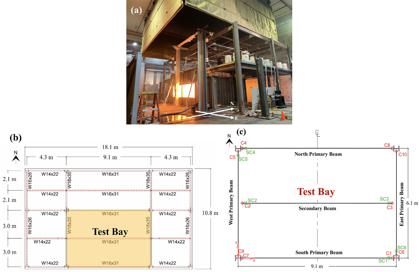 (Source: NIST); (b) Plan view of the test building and test bay location; and (c) Locations of composite connection temperature measurements in the fire test bay (C1 through C10)
