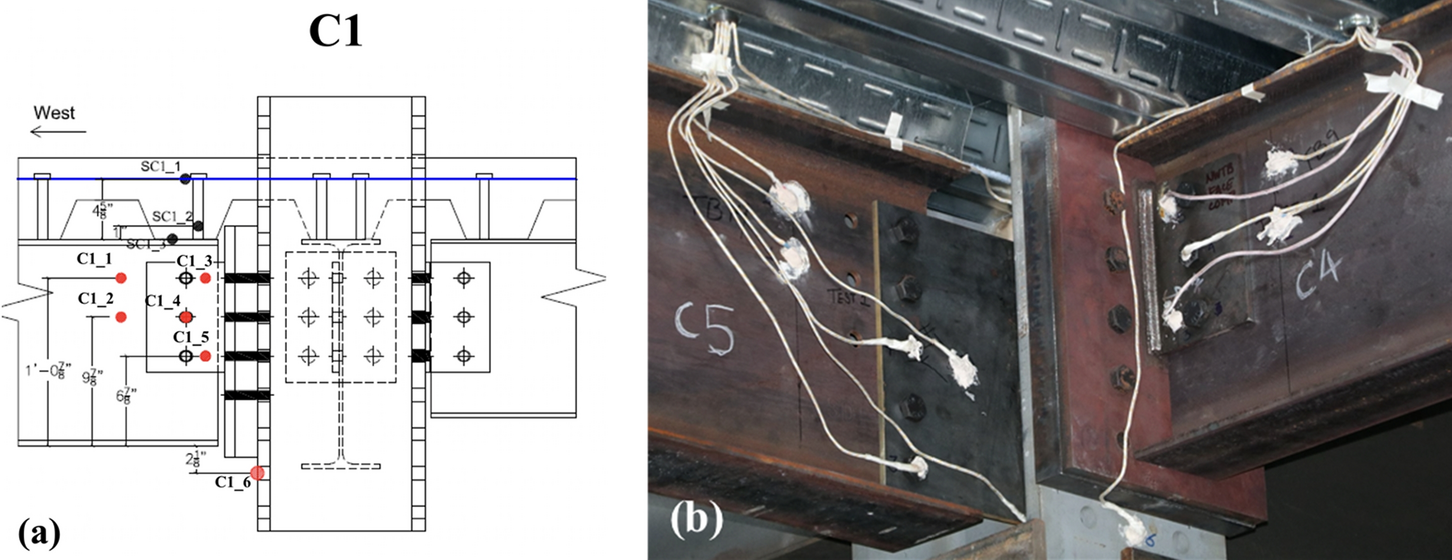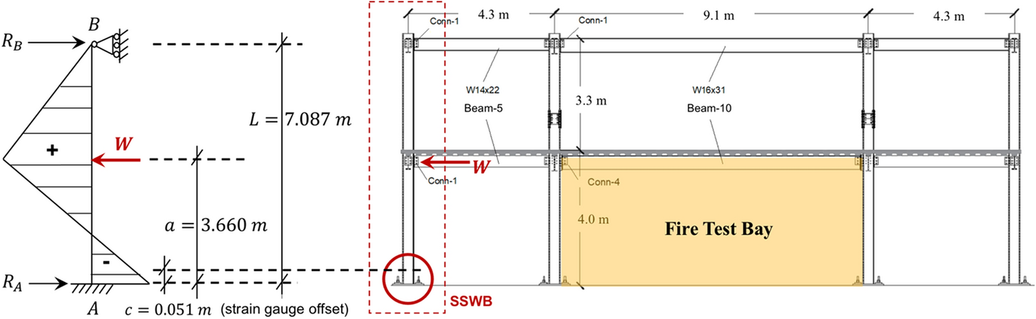 where \(h_{column}\) is the W12×106 column section height, 0.327 m, \(I_{column}\) is the section area moment of inertia, 0.00038834 m4, \(E_{steel}\) is the minimum specified Young’s modulus of elasticity 200 GPa for ASTM A992 steel [30], and \(\varepsilon_{strain}\) is the post-processed measured strains with temperature correction due to the strong axis bending, see Figure 4a for strain gauge locations.