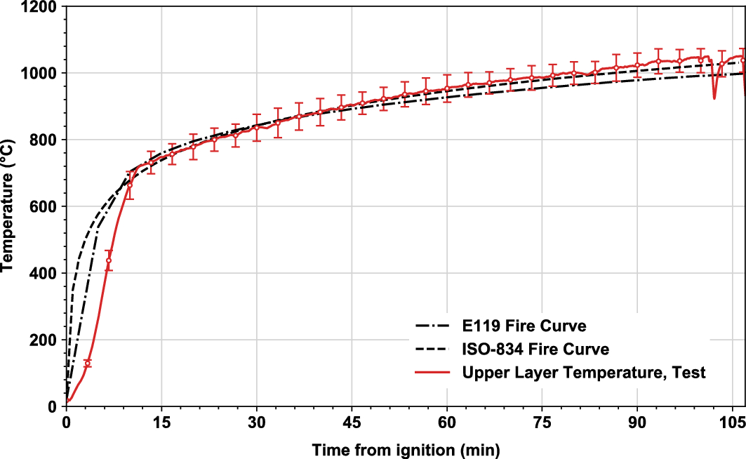 The vertical shear load imposed on the connections during the fire experiment was in the range of 20% to 40% of the ambient design capacities (see Choe et al. [28] for each connection applied load ratio). The fire load (or exposure) was applied using natural gas burners [35‐37] following the ASTM E119 temperature–time curve [18] with the duration of 107 min. The applied fire load density was estimated at 921 MJ/m2 with ± 1.5 MJ/m2 uncertainty (95% confidence interval). At 107 min the heat release rate reached its maximum value of 10.8 MW. As demonstrated in Figure 5, the test revealed that the measured time–temperature curve matched better with the ISO Standard Fire curve [10] (which includes slightly higher temperature than the ASTM E119 curve) after 45 min. The maximum standard deviation of the upper layer gas temperature was around 70°C throughout the heating regime. This standard fire environment created the condition in which the floor test assembly including the beam-end connections was exposed to a structurally significant fire. Throughout the heating phase of the test fire, large compressive forces could be initially induced in the beam-end connection regions due to restraint to thermal expansion along with significant beam end negative rotation, with these compressive forces decreasing and becoming tensile as the connected beams underwent catenary action at large vertical displacements. During the cooling phase, the tensile forces on the connections might increase and the rotational demand might slightly decrease as the connected (restrained) beams cooled down and tried to recover thermal strains from the heating phase.