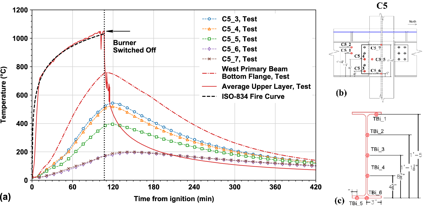 (a) Comparison of the time–temperature responses of the upper layer gas, west primary beam bottom flange, and steel connection C5; (b) Thermocouple locations at connection C5, tagged as C5_1 to C5_7; and (c) Thermocouple instrumentation locations at west primary beam midspan, tagged as TBi_1 to TBi_6