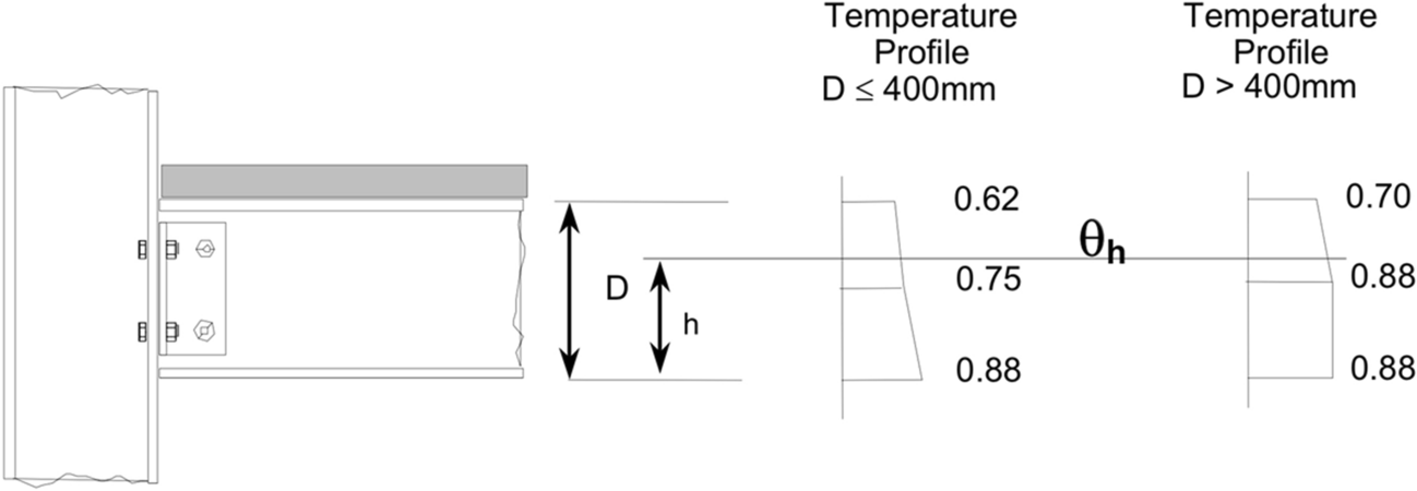 where \(\theta_{h }\) is the temperature at height h (mm) of the steel beam, see Figure 7; \(\theta_{o }\) is the bottom flange temperature of the steel beam remote from the connection; h is the height of the component being considered above the bottom of the beam in (mm); D is the depth of the beam in (mm).