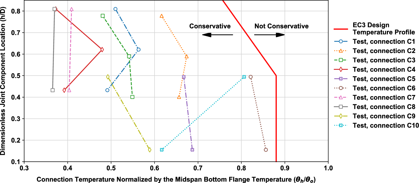 This paper compared the Eurocode 3 connection design (temperature and strength) provisions for shear tab connections with the data from a recent large-scale compartment fire test on a composite floor assembly. It was found Eurocode 3 tends to overpredict maximum temperatures of the connection components when actually heated to 400°C or lower. In contrast, the predicted temperatures become comparable to the measured temperatures when actually heated in excess of 400°C. Further, it was also found in most cases (approx. 95%), Eurocode 3 predicts much rapid cooling rates of the temperatures of the connection components, from 70°C/h to 120°C/h for the connections used in this study, whereas the measured cooling rates significantly vary from 10°C/h to 110°C/h. Although the Eurocode 3 simplified approaches are not meant to provide the details of the failure mode for connections, this study demonstrates that the Eurocode 3 method might lead to the conservative prediction on temperatures of connection components, if the connection region is applied with thicker SFRM than the connected beam.