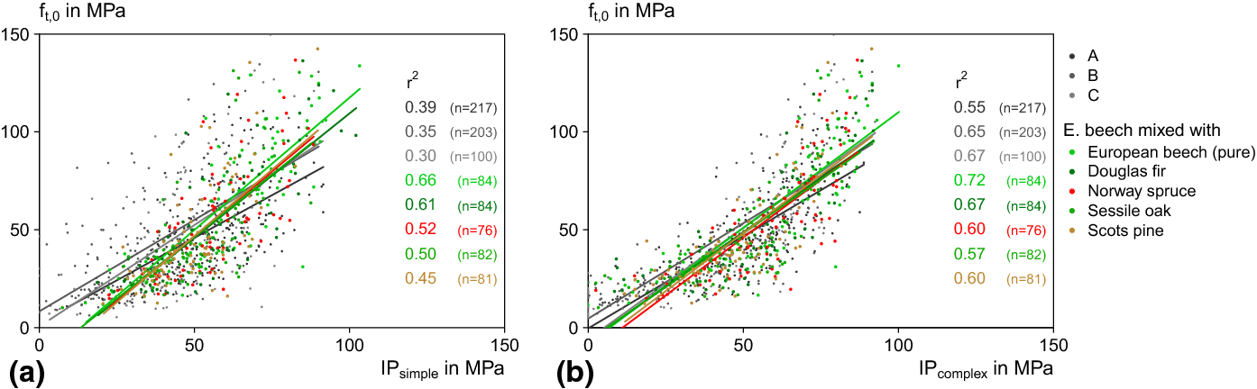 The reduction in timber strength variation for safe engineered timber structures requires a good grading model. Grading of beech timber with Edyn as a single predictor showed promising results to estimate bending strength (Brunetti et al. 2020) or stiffness and strength based on the log’s Edyn (Rais et al. 2020a; Plos et al. 2022). The tensile strength prediction values achieved were high compared to Ehrhart et al. (2018), who obtained an r2 value of only 0.16 for a high quality beech timber between strength and Edyn. The differences could be clearly attributed to the different qualities, as wood in the current analysis comprises a variety of qualities allowing a broad variation and covering a bigger scatter in properties. The knot cluster DAB together with Edyn showed a high correlation coefficient comparable to softwoods. The model showed similar regression coefficients across the different mixture types. The difference in the correlation coefficients could have its cause in the different coverage of wood qualities within the mixture types. In any case, strength class DT50 could be identified as feasible, especially for boards from pure beech forests. There seems to be the potential of producing high quality beech timber with a powerful grading model. Compared to Modelsimple, the grading with Modelcomplex, despite of only an increase of 6% in prediction accuracy, allowed to achieve significantly higher yields to the higher grades, particularly by over 10% higher yields to DT50. As shown in Fig. 5 and Fig. 6, the settings were more robust, leading to lower deviations from the desired quality (strength) level. A powerful strength prediction method was shown in Rais et al. (2021) based on a 3D interpolation of fiber deviation data from surface scans.