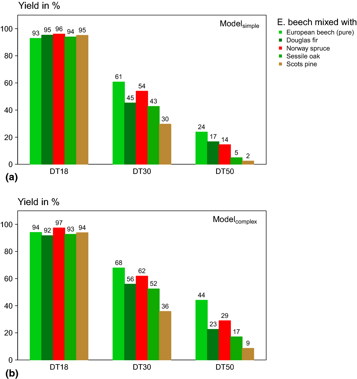 A strength class DT50 could be set out for both models, i.e., the model based solely on the Edyn and the model based on knottiness and Edyn. The yield for DT50 using Modelsimple was 12.5% (51 of 407 boards); the majority with 20 boards came from the pure beech stands, the minority with two boards from the mixed beech-pine stands. As a result, based on the simple model, 24% of the boards from pure stands could be classified to DT50, whereas just 2% of the boards from beech-pine stands were (Fig. 3a). In comparison, the yield for DT50 using Modelcomplex was 24.3% (99 of 407 boards). A share of 44% of the boards from the pure stands was assigned to DT50 (Fig. 3b). Among all mixture types and independent of the model, the yields were similar for the low grade DT18 when grading only one class in one run. All yields were higher than 90% (Fig. 3).