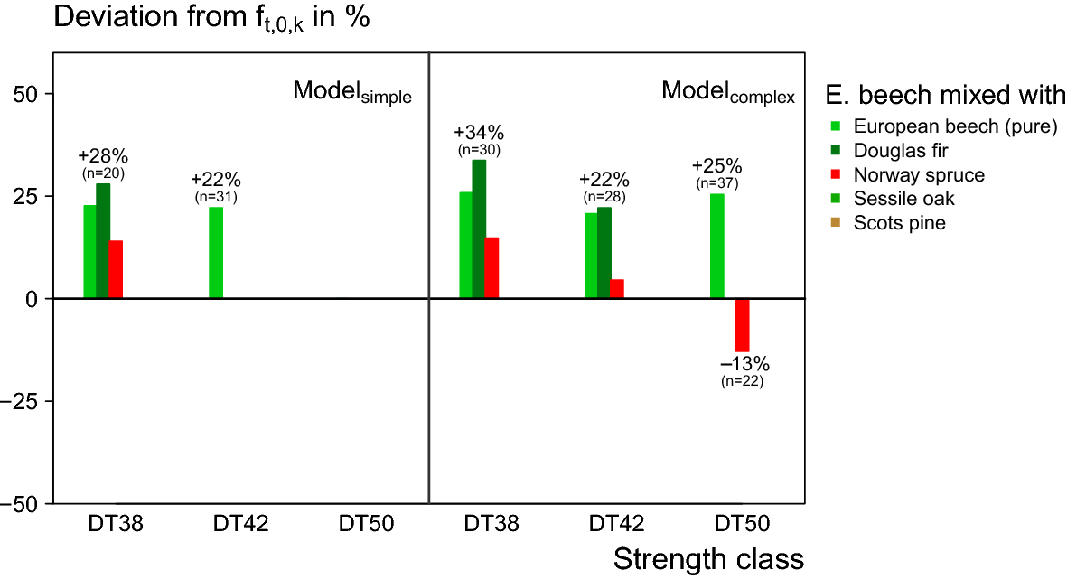 Figure 4 shows the deviation from the strength requirement for the high-strength classes DT38, DT42 and DT50. Figure 4 focuses on the higher strength class of the considered class combinations, Fig. 5 and Fig. 6 on the second lower class. Apart from the boards from the beech-spruce mixture in DT50 (Modelcomplex), the random samples of all mixture types, classes and models met the strength requirements. The samples from the beech-oak and beech-pine stands had less than 20 boards in the high class, so that the characteristic strength value was not calculated.