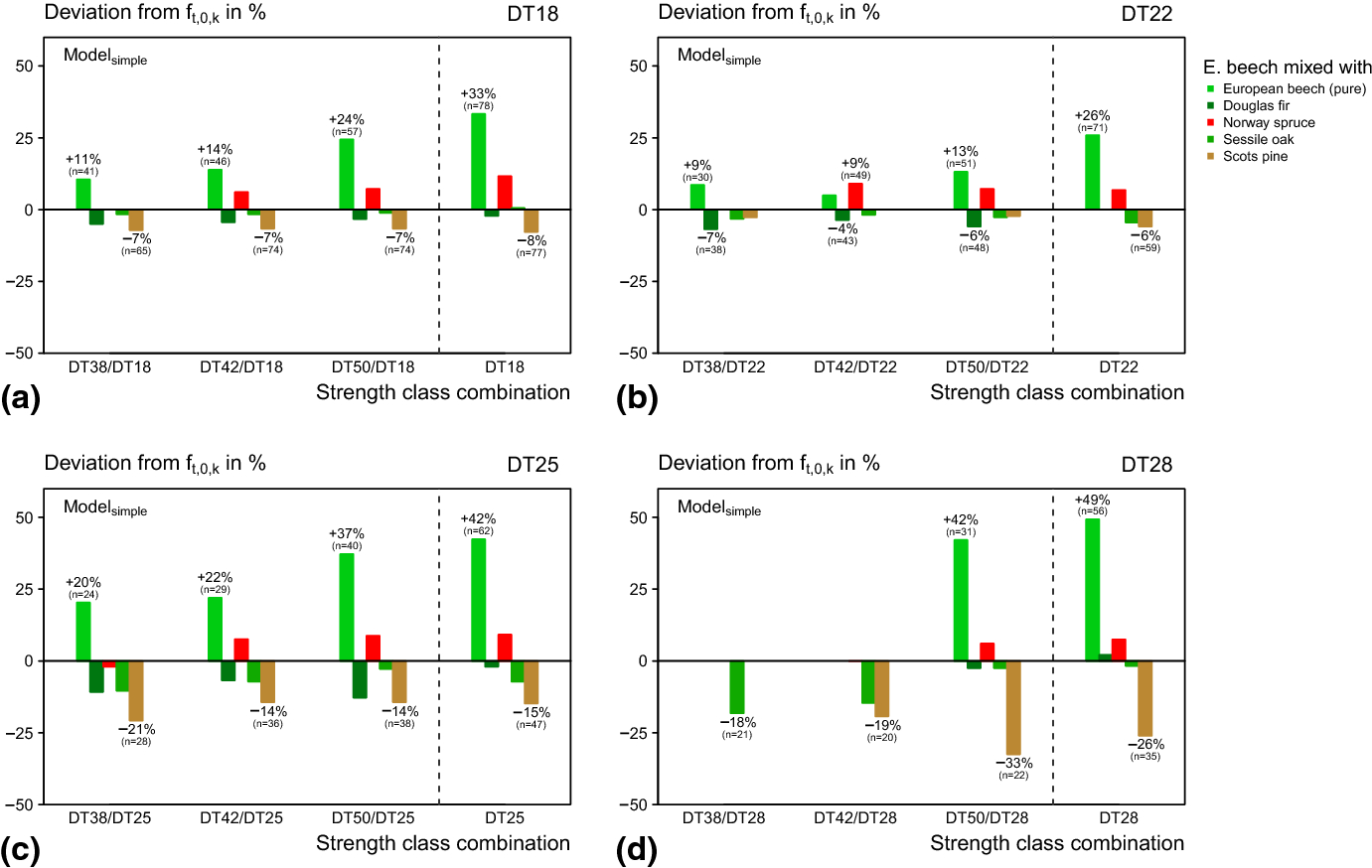 Seven times using Modelsimple and four times using Modelcomplex, the characteristic value of beech-pine stands missed the required strength value by more than 10%. Boards from beech-oak stands showed mainly negative deviations but only five combinations were lower than −10%: DT42/DT28 and DT38/DT28 based on Modelsimple and DT38/DT25, DT28 and DT25 based on Modelcomplex. Boards from beech-spruce stands did not deviate a lot. They never missed the requirement for a strength class by more than 10%; the lowest deviation was at DT50/DT25 when the benchmark for DT25 was missed by 8% (Modelcomplex). Boards from beech-Douglas fir stands only missed once the requirement for a class by more than 10% at DT38/DT25 with −11% (Modelsimple).