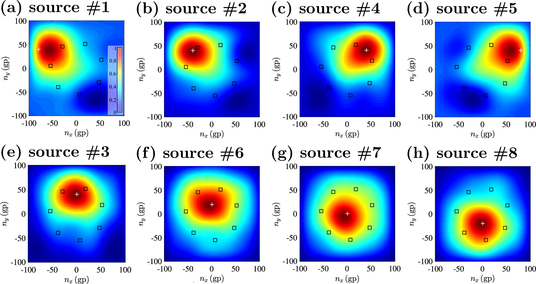 TRM results showing the 2D representation of \(\bar{p}_{\max }(\textbf{x})\) due to the synthetic acoustic sources #1 through #8. The synthetic microphone positions are indicated by ‘\(\square \)’ and ‘+’ are the reference acoustic source locations