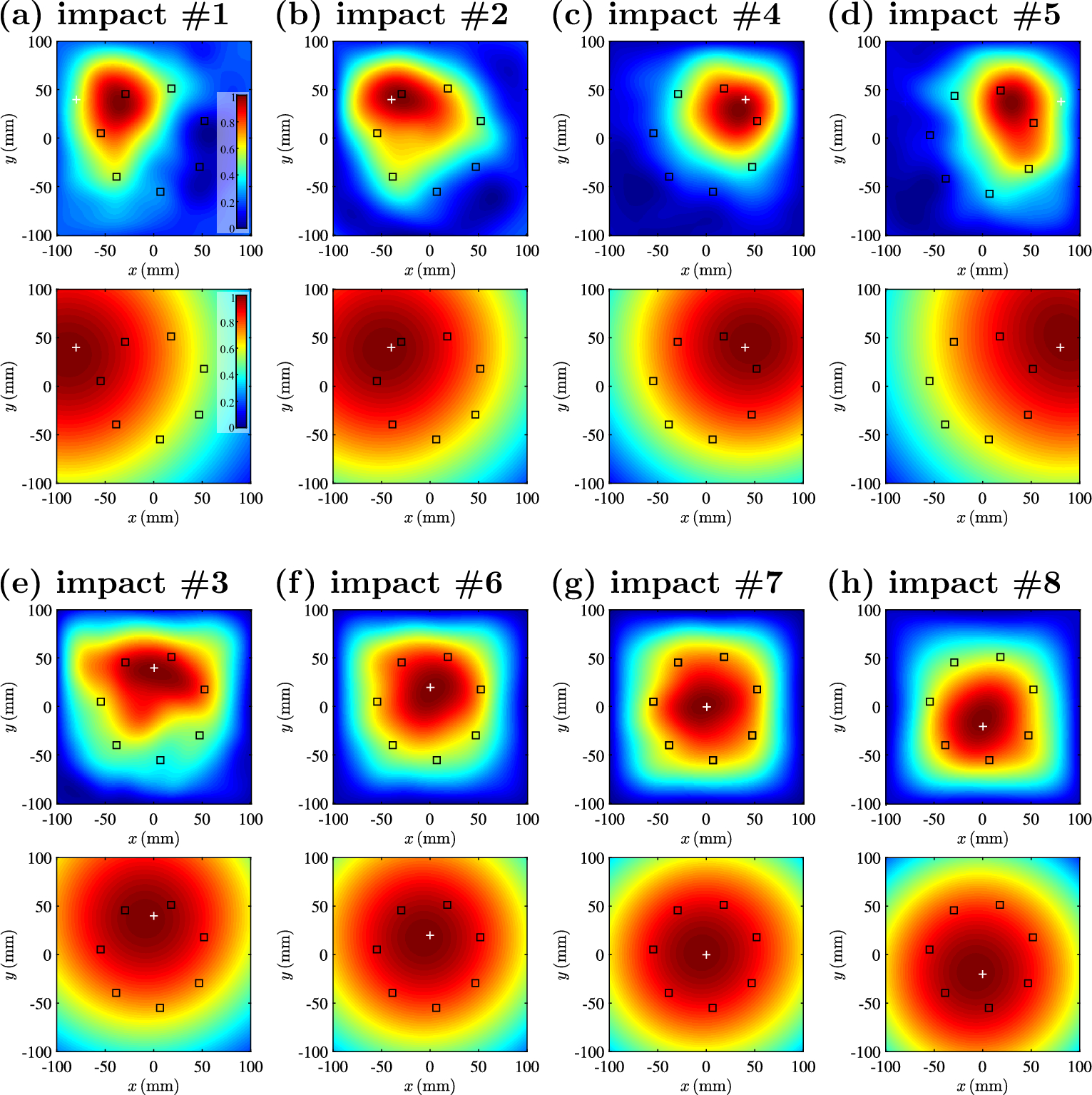 Comparison of TRM results \(\bar{p}_{\max }(\textbf{x})\) (top) with beamformer responses \(\bar{b}_{f,\max }(\textbf{x}_{j})\) (bottom) due to the first pendulum impacts #1 through #8, respectively. The microphone positions are indicated by ‘\(\square \)’ and ‘+’ are the reference pendulum impact locations